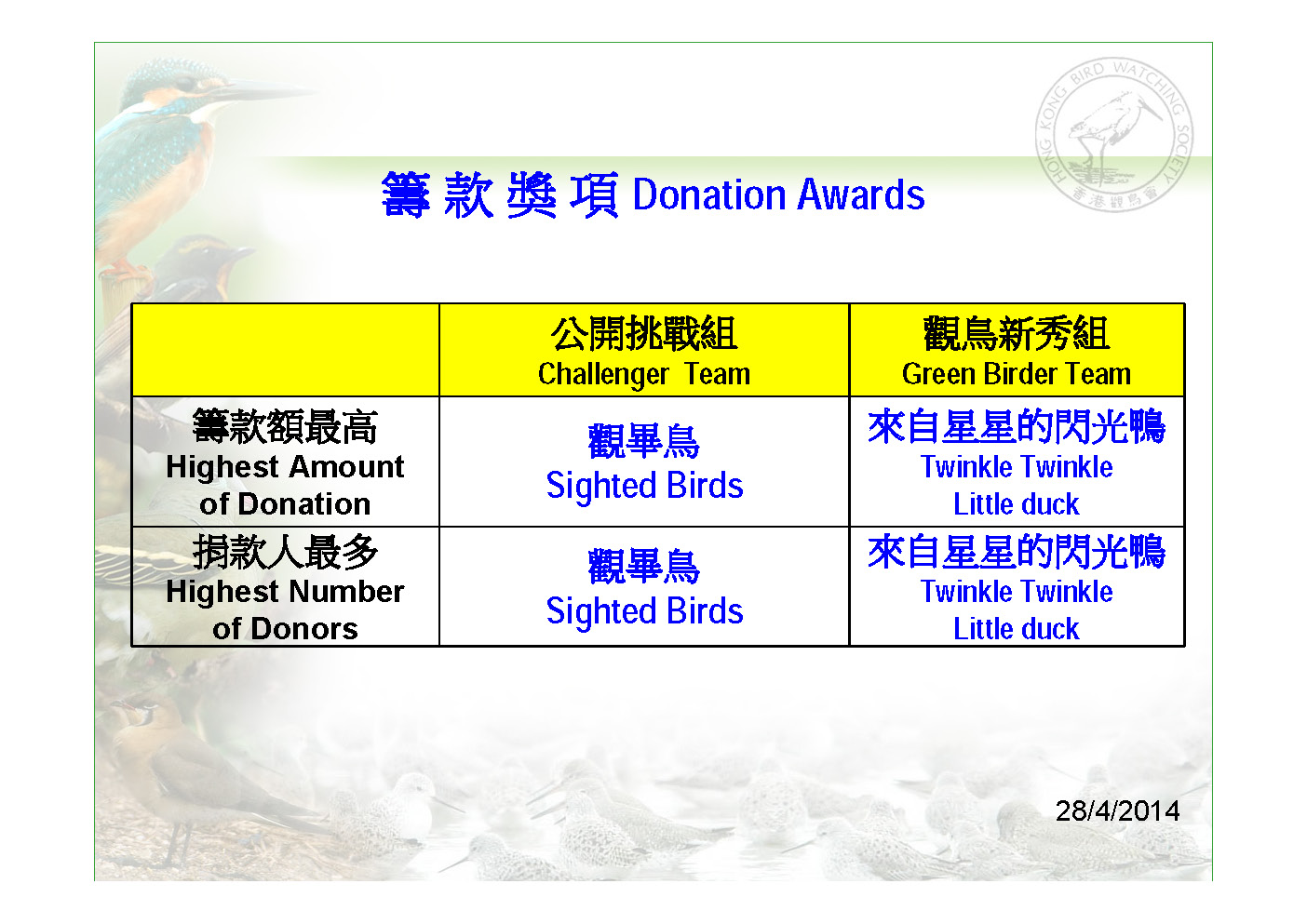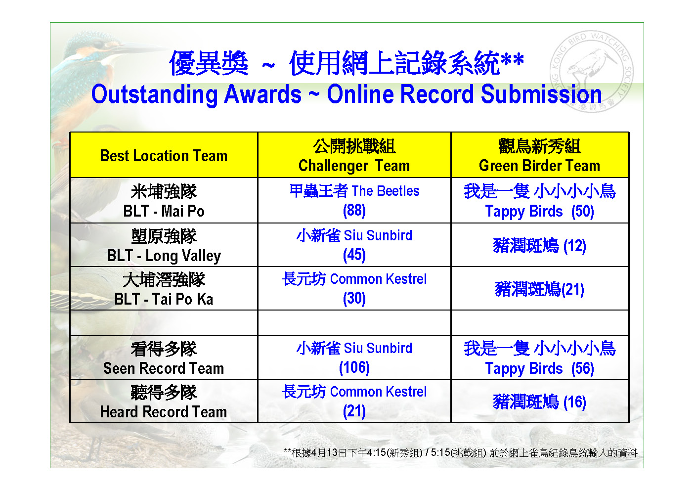 香 港 觀 鳥 日 暨 觀鳥比賽籌款活動 Hong Kong Bird Watching Day Cum Bird Race Fundraising Event