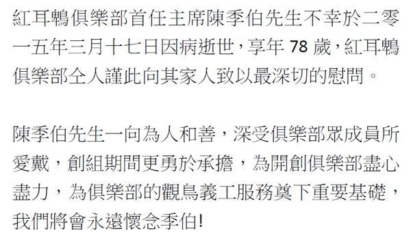 » 紅耳鵯首任主席陳季伯先生仙遊