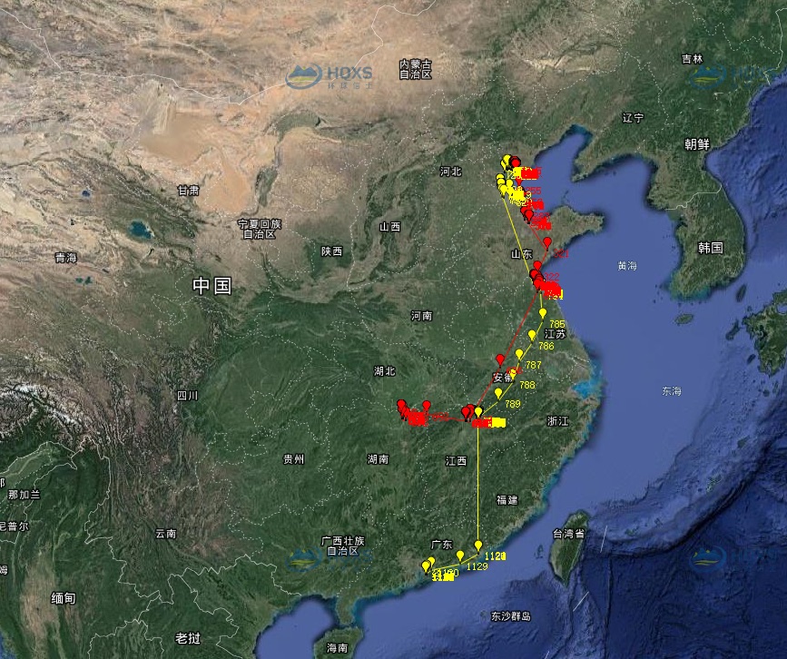 2019年8-9月份她在渤海灣遊蕩,10月14正式南遷,在黃驊海岸有逗留,10月26日到連雲港,10月29日離開連雲港,10月30日到達洞庭湖,2020年1月7日離開鄱陽湖沿著潮州、汕尾到達香港米埔,她的伴侶則仍在洞庭湖。