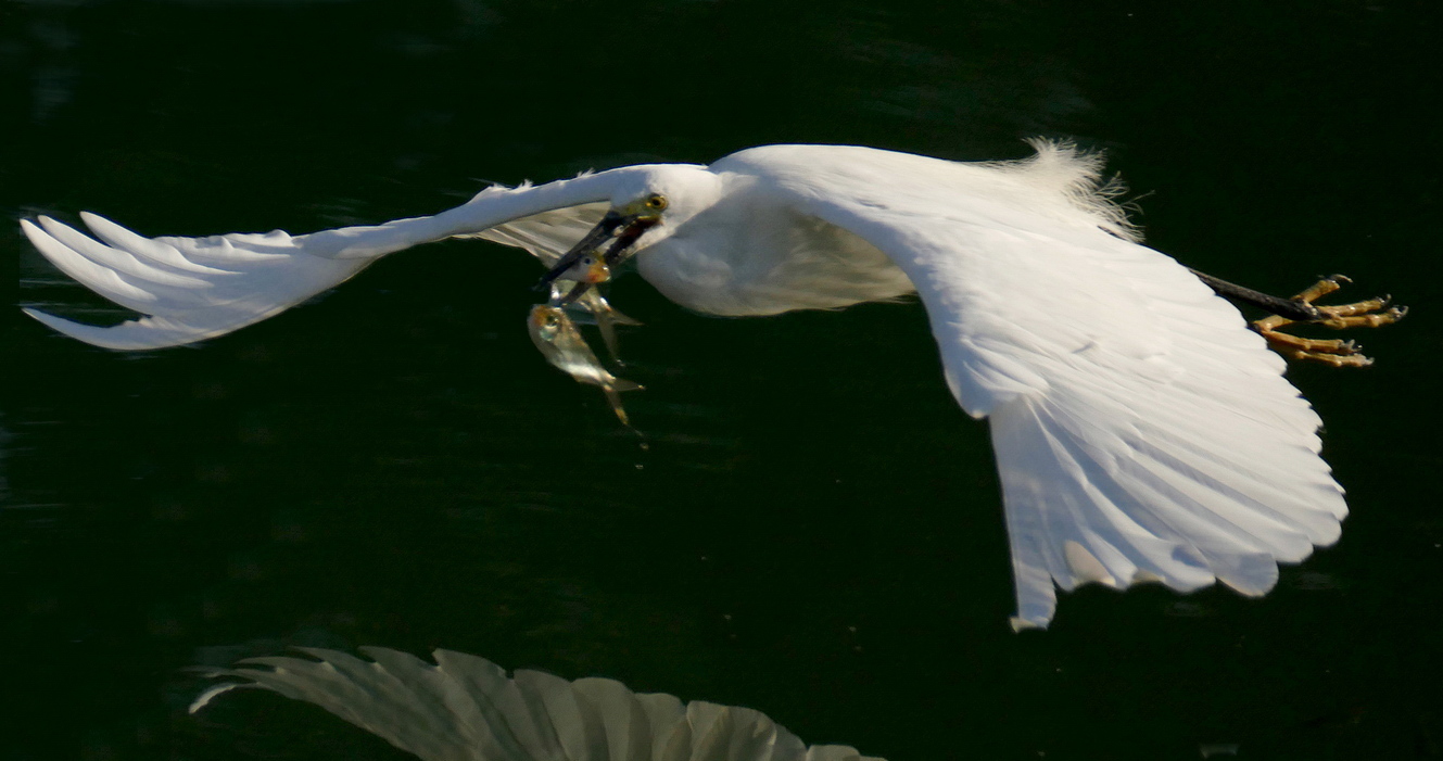 If wasn't easy to hold two struggling and slippery fishes in the beak.