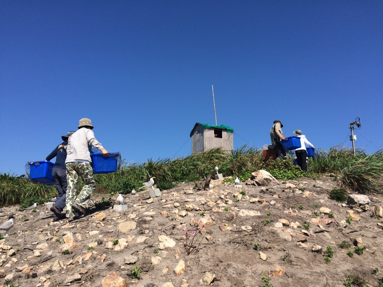 8月4日早上,國際專家團隊在浙江省韭山列島國家級自然保護區進行了燕鷗雛鳥的環誌工作,這是最近兩年在該地進行燕鷗繁殖地恢復及招引計劃的一部份,以證明及評估計劃的成效,最終目標是為「大鳯頭燕鷗」及極度瀕危的「中華鳯頭燕鷗」提供一個安全及良好的繁殖地。(註:由於在最近幾年發現的中華鳳頭燕鷗均是與大鳳頭燕鷗混在一起,並使用同一地點作為繁殖地,因此我們需要同時保育大鳳頭燕鷗,而為了安全起見,我們亦以大鳳頭燕鷗作為環誌的鳥種,而並非中華鳳頭燕鷗。)