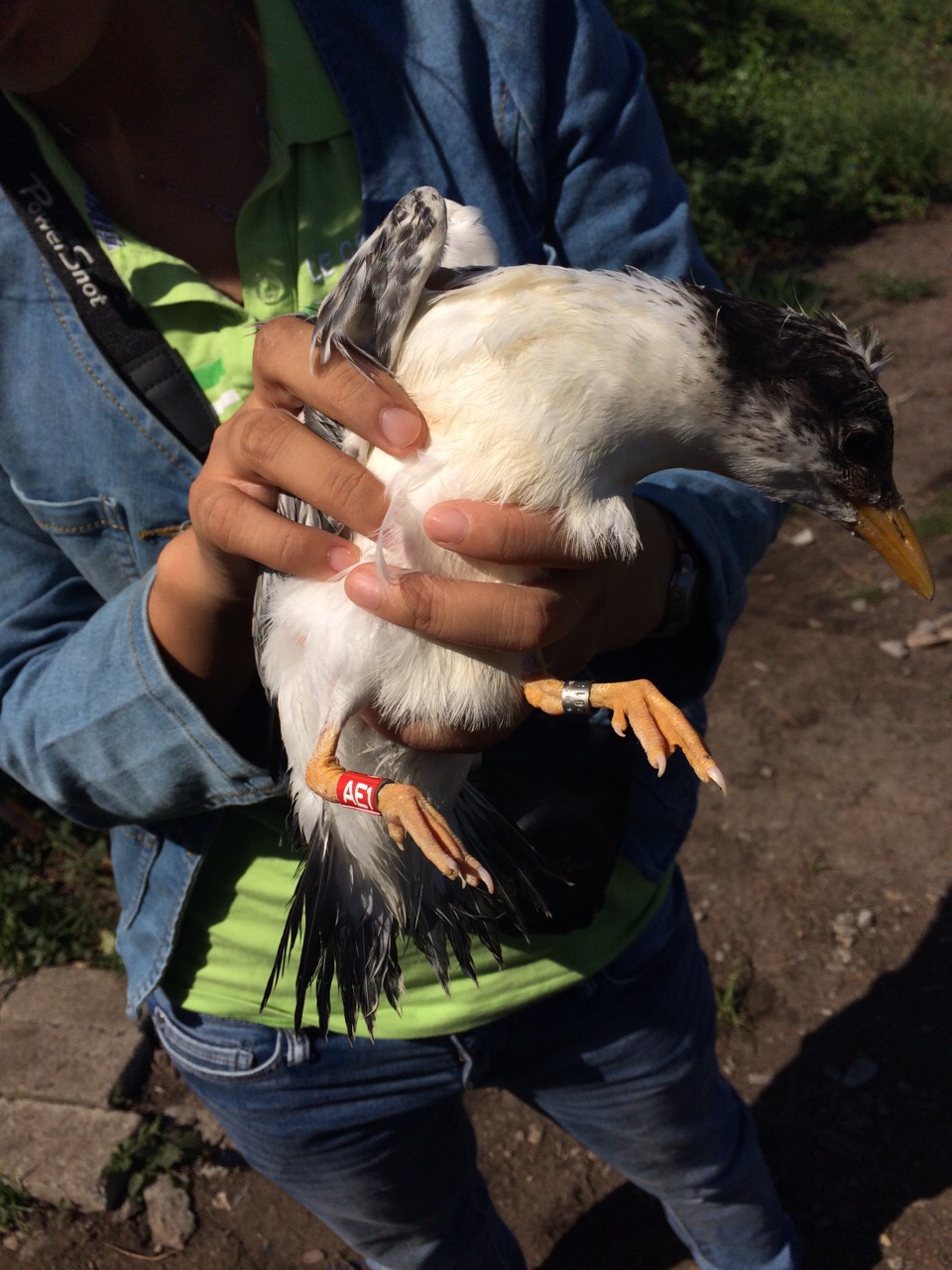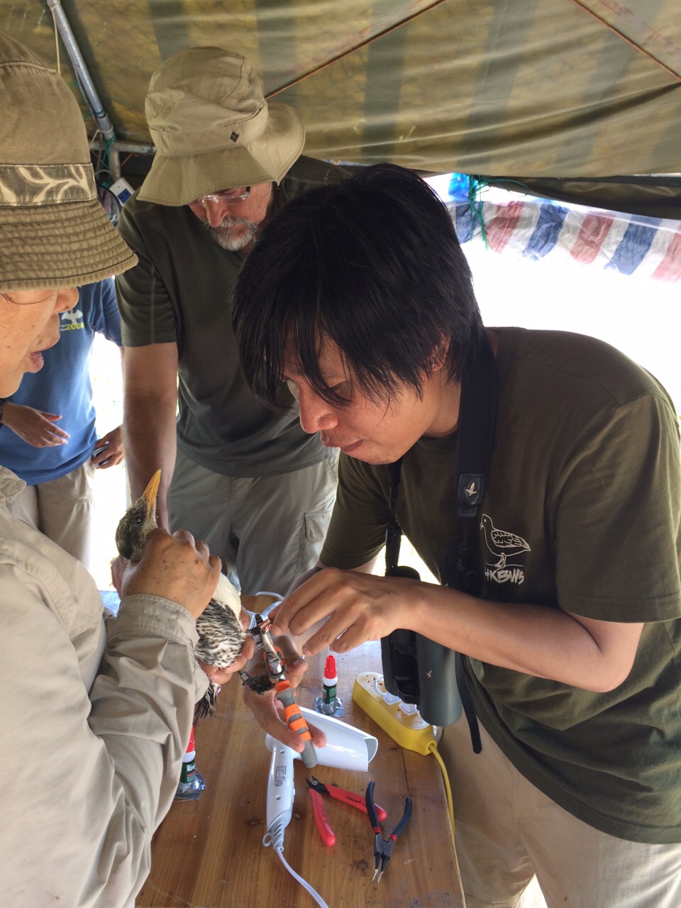 經過四小時的工作,我們一共環誌了31隻大鳳頭燕鷗,在左腳跗蹠上配有金屬環,而右腳跗蹠上則帶上紅色彩環(上有白色編號,如:AE1)。