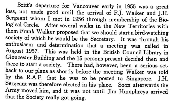 In June (1957), Sergeant F. J. Walker, R.A.F., sent out a circular letter telling of the "growing need for the formation of a competent ornithological society in the Colony" and calling on all those interested to contact him