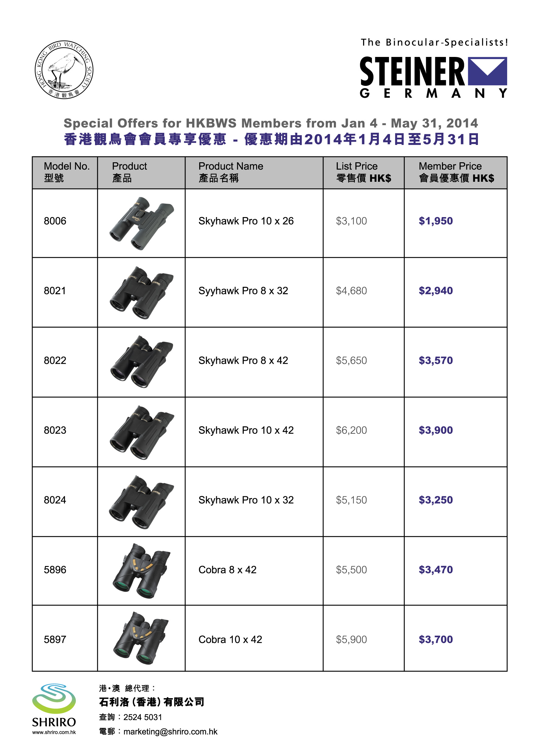 Steiner望遠鏡優惠 Special Offer of Steiner Binoculars 2014/01-2014/05