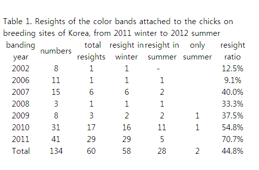 經過韓國專家Dr. Kisup Lee把環誌黑臉琵鷺於2011至2012年的觀察紀錄(主要記載於韓國,香港及臺灣的數據庫)整合後, 得出了一些有趣的結果。由2002年開始, 總數有134隻黑瞼琵鷺被環誌,當中有58隻於2011至2012年的冬天於越冬地曾被目擊,58隻被觀察到的雀鳥當中有23隻冬季過後重返南韓,當中更包括K82及K90這兩隻未有於越冬地被觀察到的黑臉琵鷺。換言之, 於134隻被環誌的黑臉瑟鷺中, 有多達60隻於一年之間被觀察到,佔整體44.8%。有41隻在2011年夏天出生的幼鳥被環誌,其中的29隻於當年冬天於越冬地再被觀察到,至少70%已環誌的幼鳥在首次遷徙中成功到達越冬地,比2010年的65-68%為高。事實證明, 環誌工作對黑臉瑟鷺的保育及監察有一定的作用, 另外亦要多謝各位有份提交環誌黑臉琵鷺觀察記錄的鳥友,希望各位可以繼續支持黑臉琵鷺的保育工作。