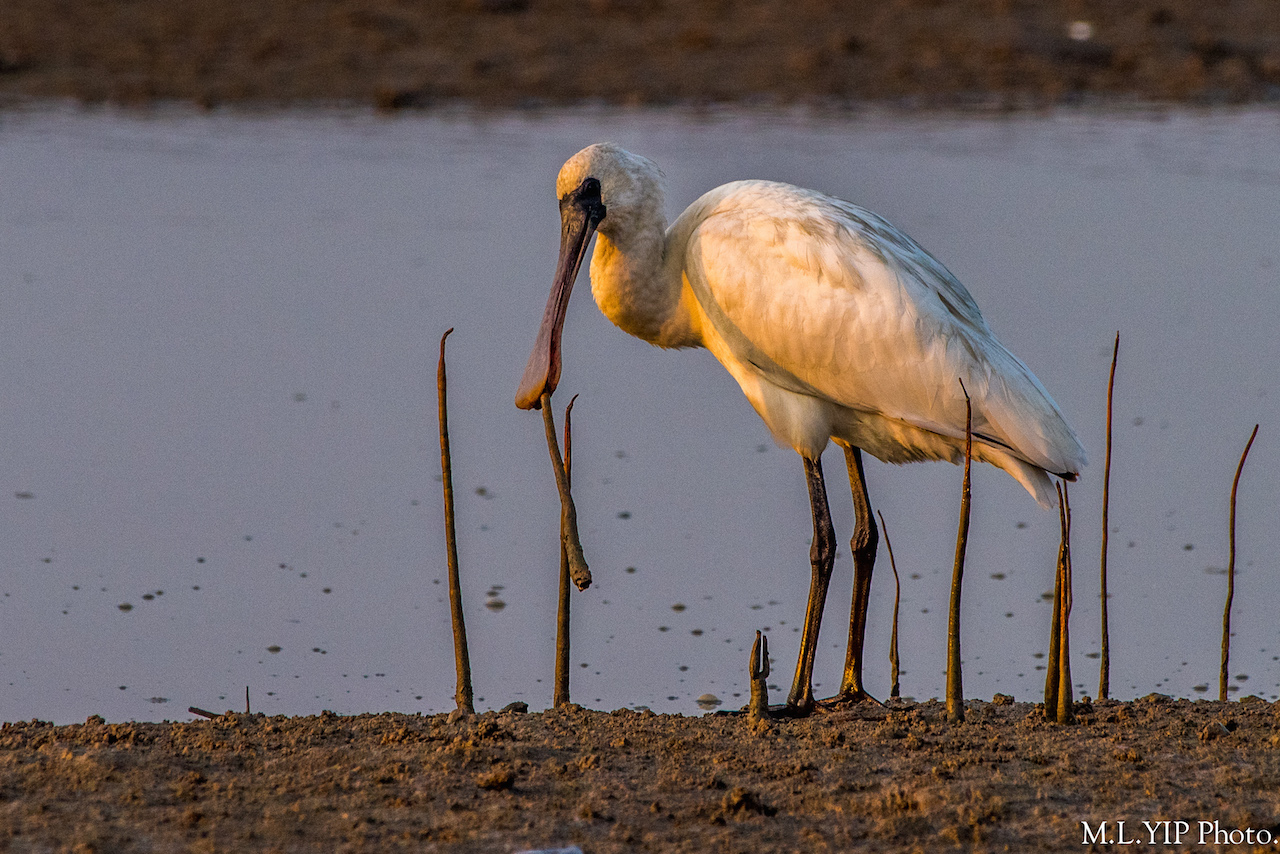這隻黑臉琵鷺,不知何解,一早就在泥灘上拔掉一些紅樹.