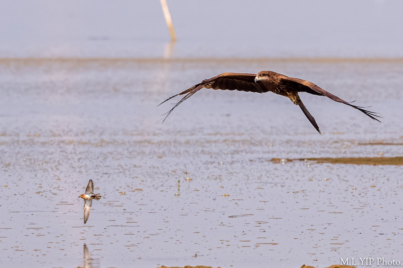泥灘上黑鳶窮追一隻估計是紅頸濱鷸,結果如何? 你猜猜吧.