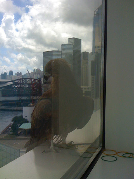 "This Black Eared Kite was sitting outside my office window the other day. I think he was a juvenlie on one of his first flights as he was tired and scared and very noisy. He was sitting on this ledge for 4 hours before getting his courage up to fly away.