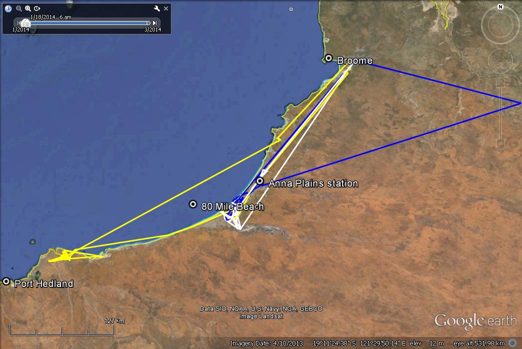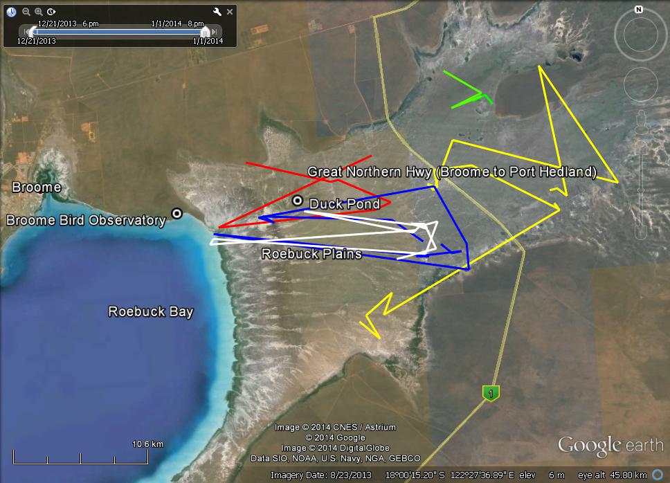 The first map shows typical gyrations of the five Little Curlew around Roebuck Plains during the period they were there from early November to mid-January. Each track covers approximately a week of movements for a bird. The second map shows the movements of the three Little Curlew which moved down to Anna Plains (and one to Port Hedland) for the period between late January and mid-March.