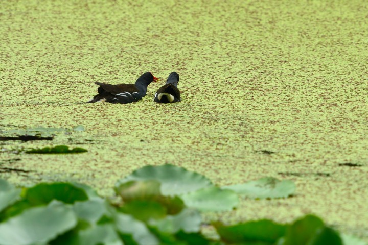 Two common moorhens emerged from a lily plantation in Long Valley on April 28th.  The moorhen on the left lifted up its bill to utter low-winded garrulous talks to the moorhen on the right.  It yacked all the way before disappeared behind the water weeds.