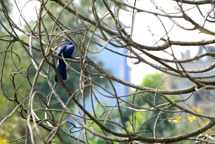 With an oval black crystal pupil surrounded by crimson iris, the male koel scrutinized the spider's web-liked branches around him in Shek Kong on January 28th. Taking a final look at the back of the tree, he took off by spreading his wings manipulated through the interlocking branches. The charcoal plumage radiated a brilliant bluish tone under the high sky.