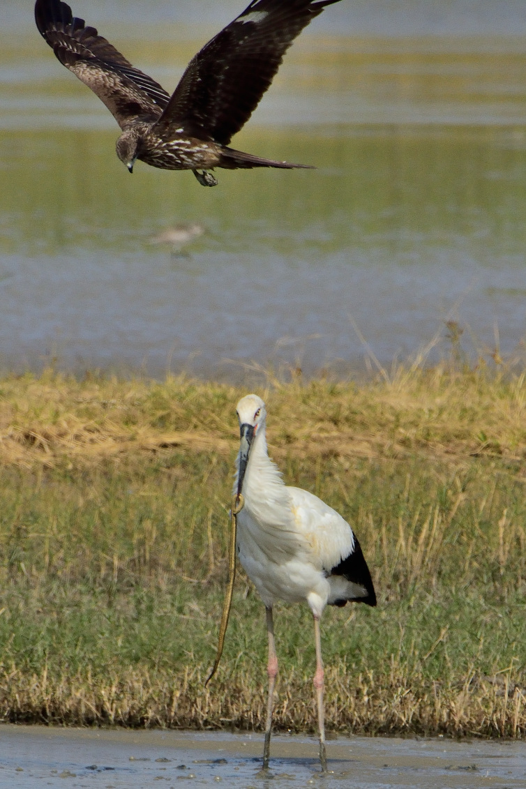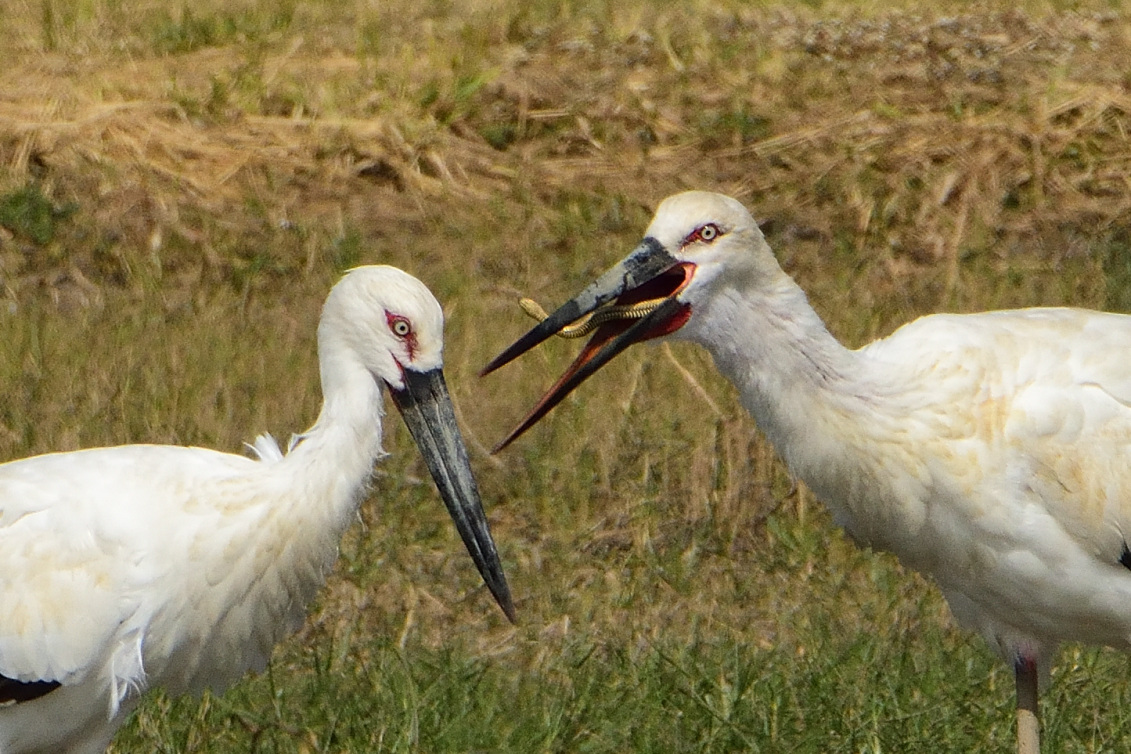 很高興目睹東方白鸛,由尋找,捕獲,控制,清洗,吞食一條蛇的過程,中間經歷麻鷹打擾,伴侶支持及分享喜悅.