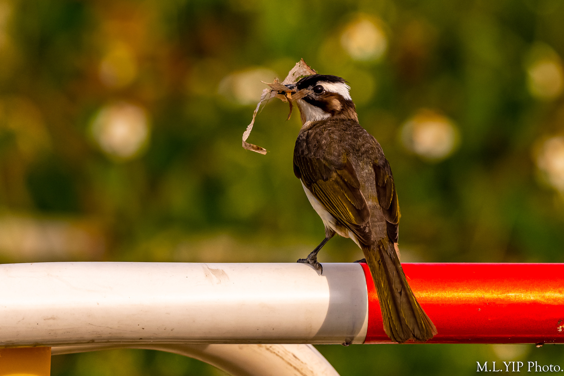 這隻白頭鵯似銜著築巢的材料,可能正在努力尋找可以築巢的地方.
