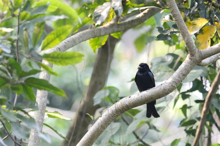 With his black plumage radiated glossy cupper-blue tone under the sunlight and his spread-out elongated tail, this drongo perched on a horizontal branch at Ho Chung on April 6th.  He stared at me for the past half an hour with the look of a predator checking on his prey.  He is an unrelenting hair-crested drongo.