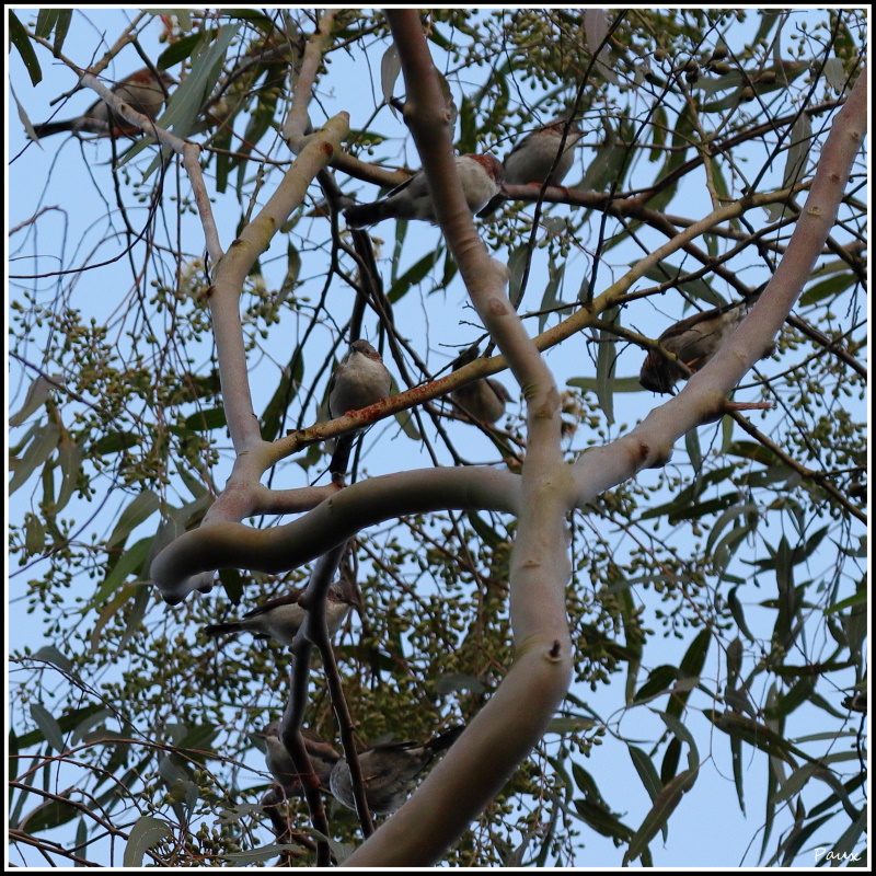 A flock of noisy birds feeding on the tree top.