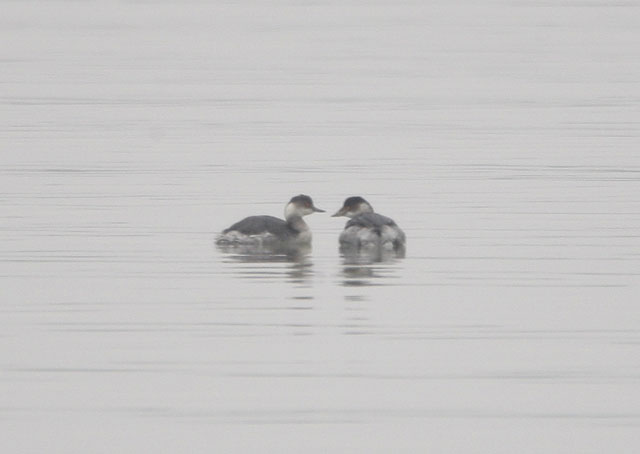 Another record shot of the 2 black necked (?) grebes at TBT today. At a distance the apparent structural differences in the bills of these 2 birds suggested that the right hand bird might be Slavonian. However, on closer inspection, the base of the bill of this bird either has a growth, or something wrapped around it, resulting in apparent deformity. The steep forehead, and the pattern of black on the cheeks of this bird, are more suggestive of black necked. Finally, these two birds were engaging in short courtship displays.