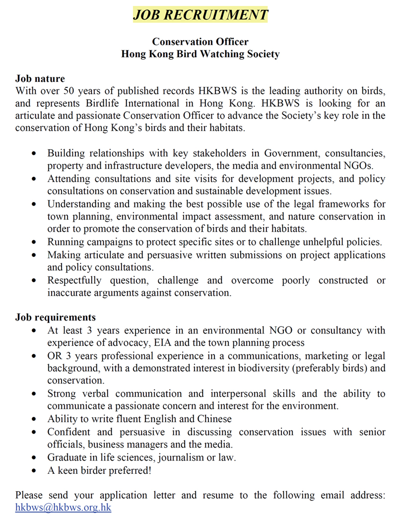 » HKBWS Job Recruitment 香港觀鳥會職位招聘