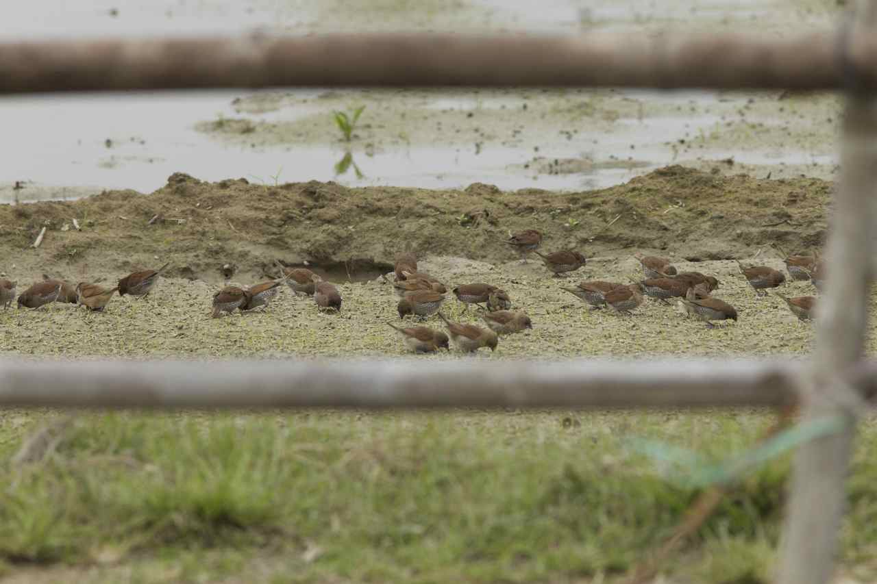 Last Sunday at Long Valley, we saw and took pictures of these - a group of munia eating the newly grown sprouts planted by the farmers even with the CD hanging there and a scarecrow. It seems that the farmers have no better coping mechanism for getting the birds away (I did see one case in Fanling, a Chinese Bulbul was hung over a small farming area in attempt to scare the other birds away; I told the owner of the land to let go the bird; otherwise...). I want to see if there are in this society any experts on this matter, to help the farmers to cope with that and to help them to live happily with the birds. I bet AFCD has done something like that before and it does not seem working.