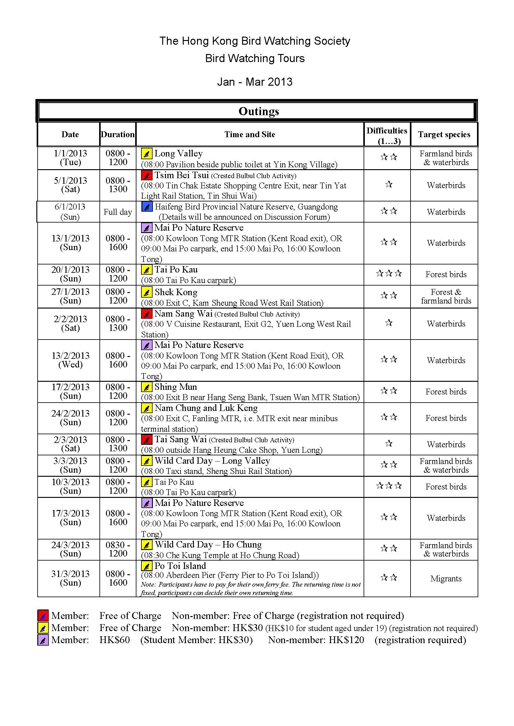 2013年1-3月 戶外觀鳥活動時間表 Jan-Mar 2013 Outing Timetable