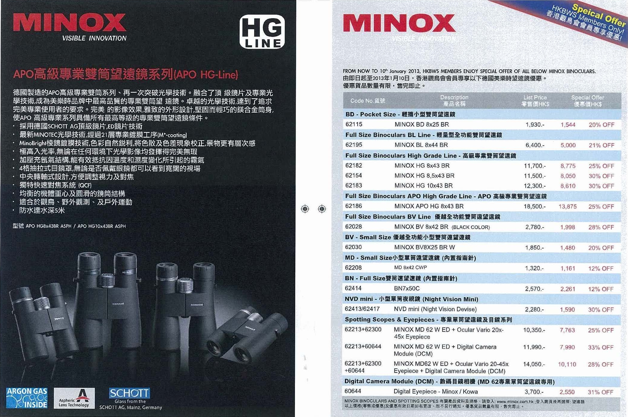美樂時望遠鏡優惠Special Offer of Minox Binoculars 2012-10 ~ 2013-01