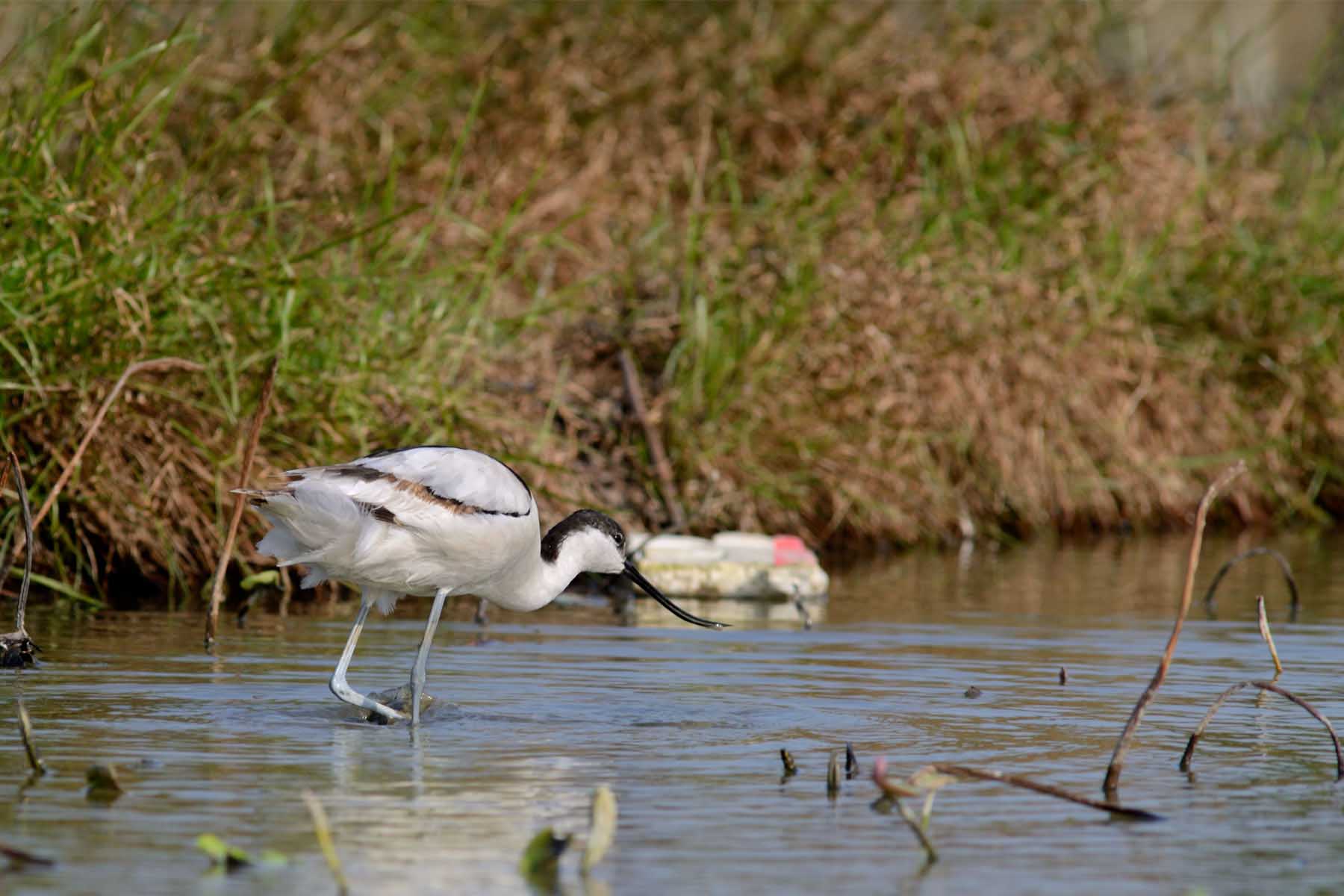 Covered with white plumage except for black scapula and mantle sides, decorated with blacks from the crown to hindneck, the pied avocet is a striking wader. Swaying its neck from side to side, scything its narrow elongated up-curved bill across the water surface, this avocet takes the stage in a shallow brackish water pond in Long Valley in the afternoon of 23rd of December 2012.