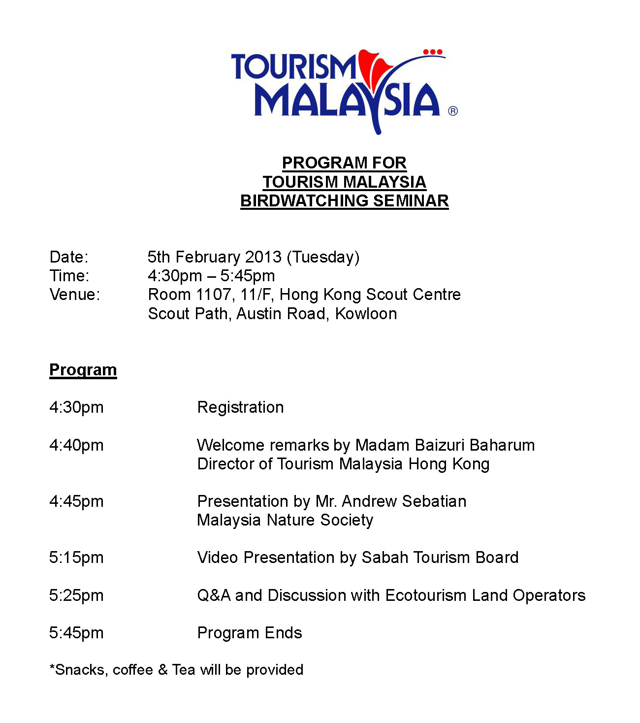 For enquiry, please call Malaysia Tourism Promotion Board (Hong Kong office) at 2528-5810.   For RSVP, please email to tourism_malaysia@ymail.com or fax to 2865-4610 by 4th February 2013 (Mon).