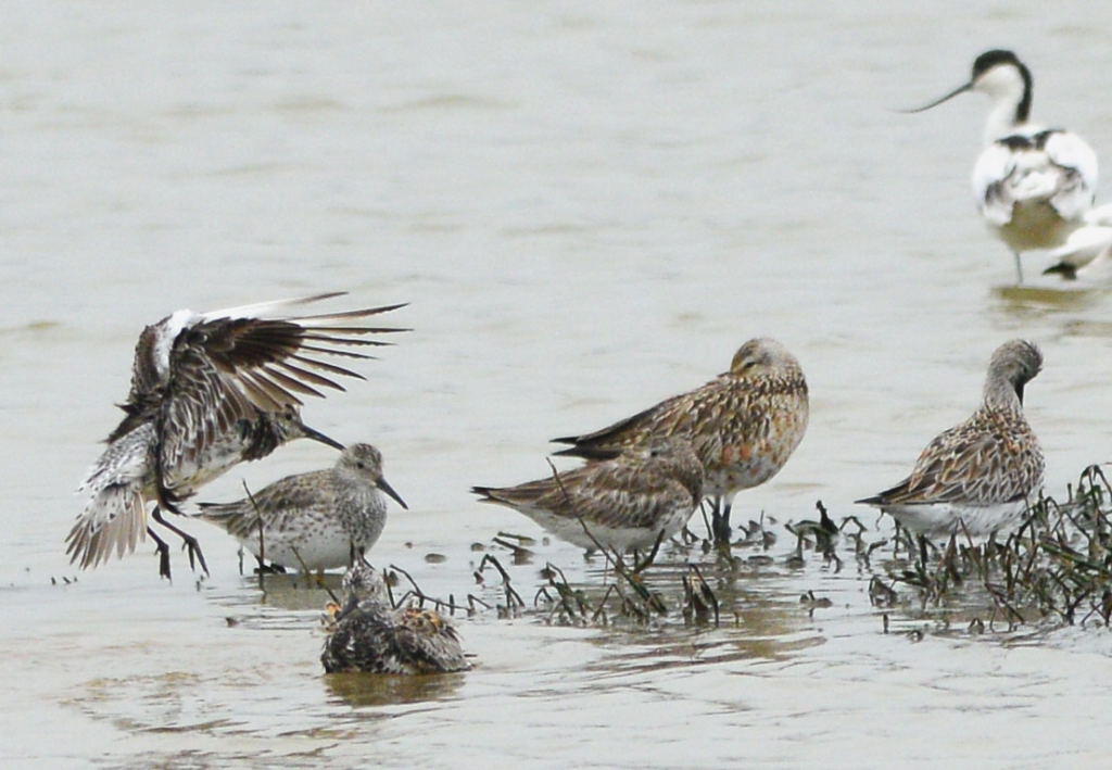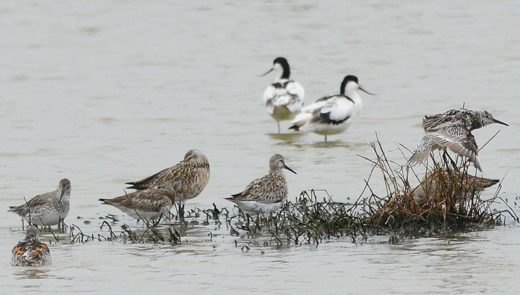 Most of the standing birds are also Great Knot (with varying amounts of breeding plumage), also with a couple of Bar-tailed Godwits and Pied Avocets.