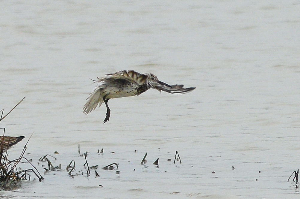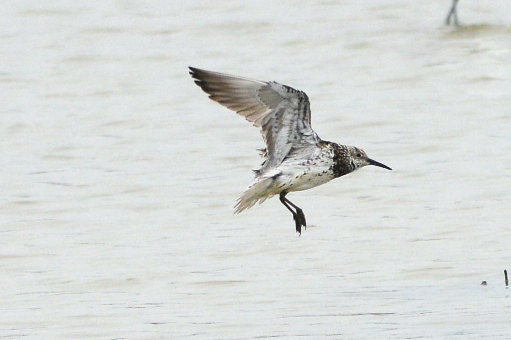 The bird is flight is a Great Knot - notice the black breast-band and pale rump patch.