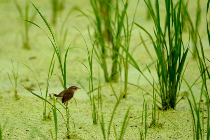 The spring grown on a paddy field in Long Valley displayed a dull monotonous green on April 25th. Not until this prinia sprang in from below. She is a plain prinia, however, she adds chromatic dimension to the picture.