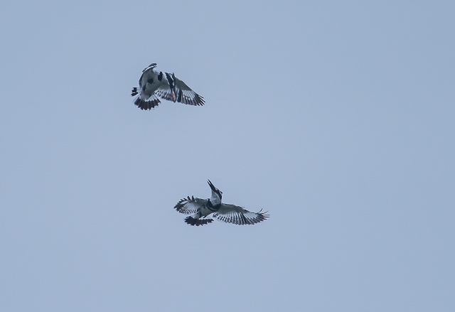 I did a bit of research on the net, .. pied kingfishers raise their young, not only in pairs but up to 3 or 4 bird, .. a father, a mother, and one or two others which could be the young from the previous year or totally un-related. but they build their hole together as a pair, therefore, i think the female which we saw flying around, may not necessiarly be the mother, or if she is the mother-to-be, then the male maybe trying to entice her back to the hole with the gift.