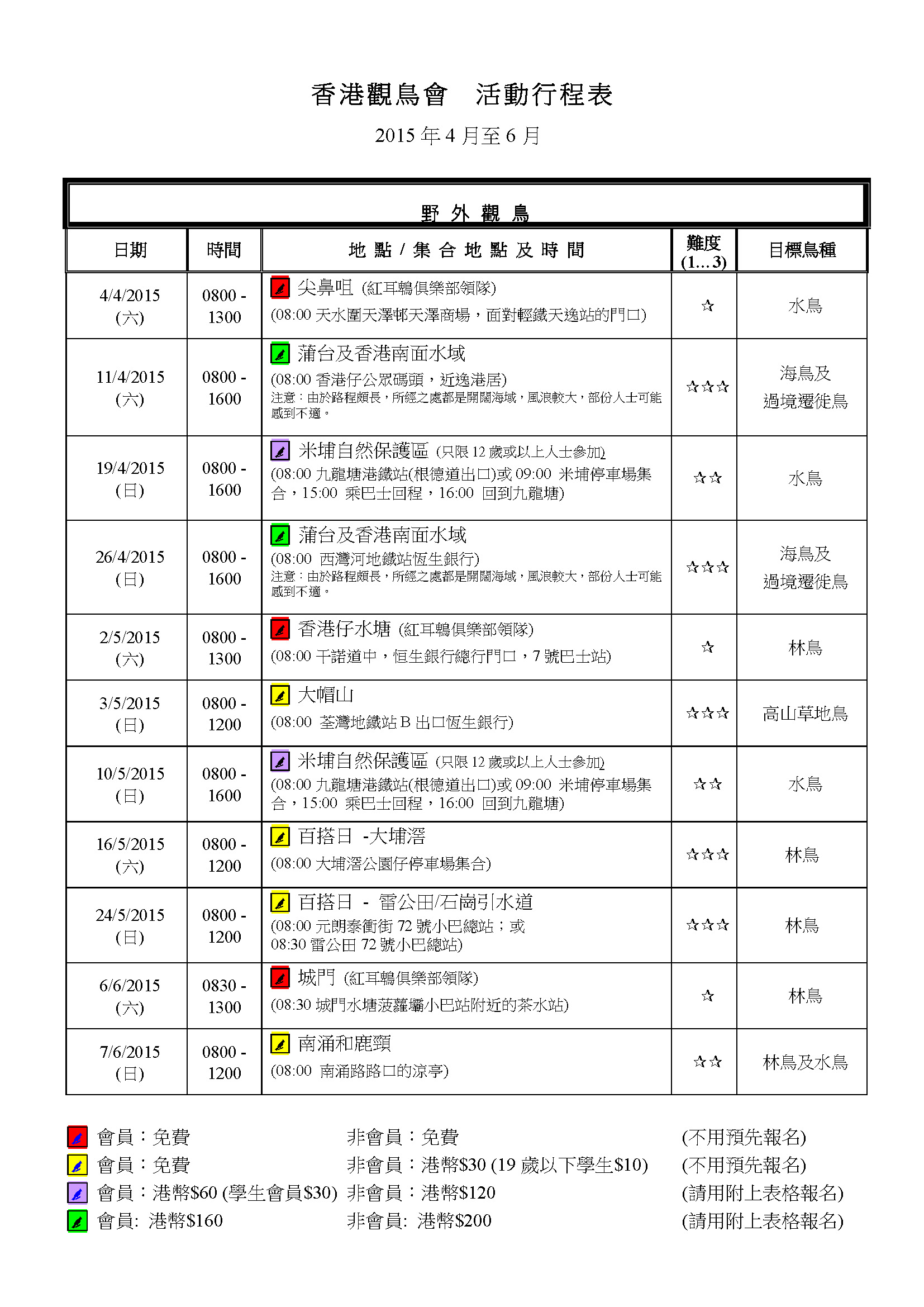 2015年4-6月戶外觀鳥活動時間表 Apr-Jun 2015 Outing Timetable