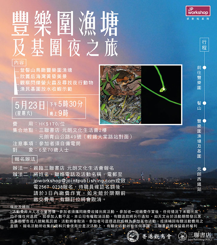 香港觀鳥會將於5月23日與三聯書店合辦的豐樂圍漁塘及基圍夜之旅,現已開始報名。請多多支持!