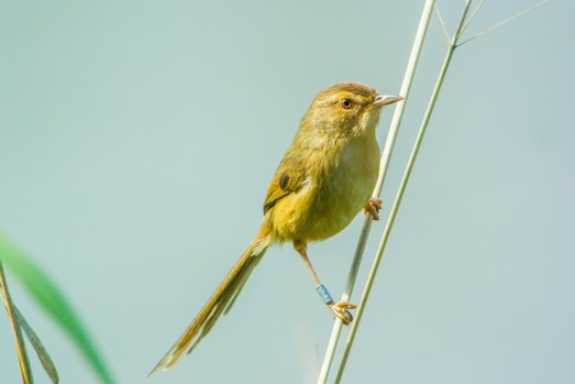 Unfortunately there is not enough of the ring visible to read the ring number and confirm which individual is involved. We ring quite a lot of Plain Prinias. If you have any more photos showing the ring from a slightly different angle, it may be possible to read more of the ring number