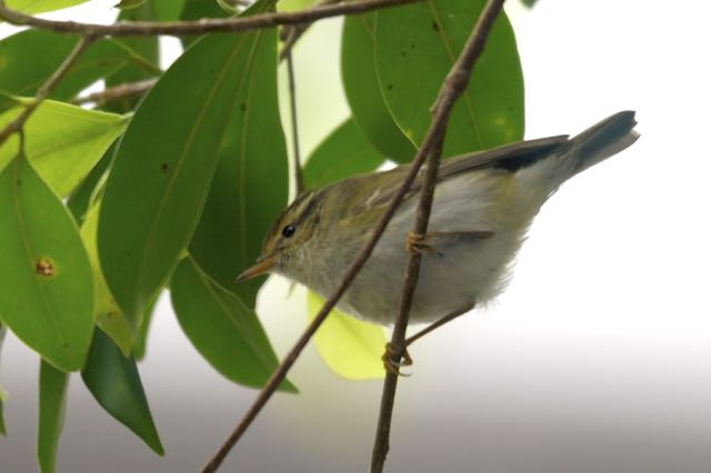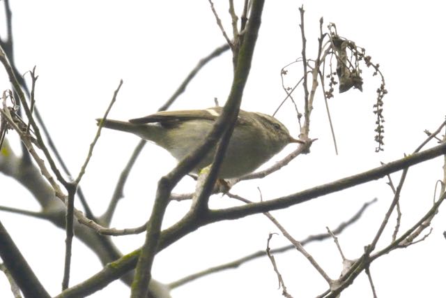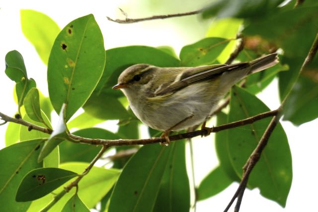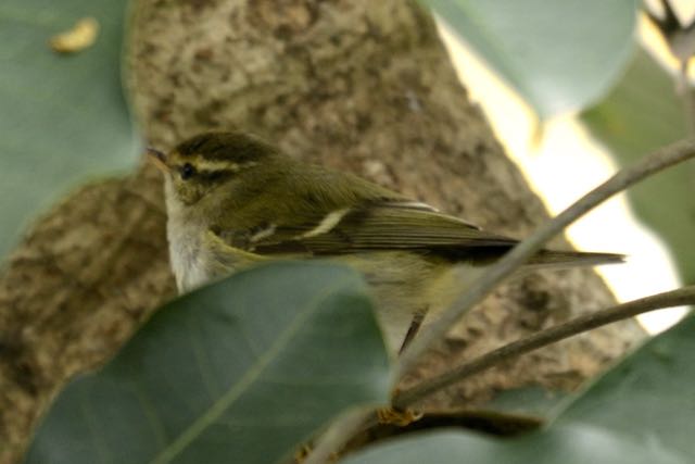 Yellow-browed Warbler: no crown stripe, dark bill tip, two broad wing bars, white-edged tertials.