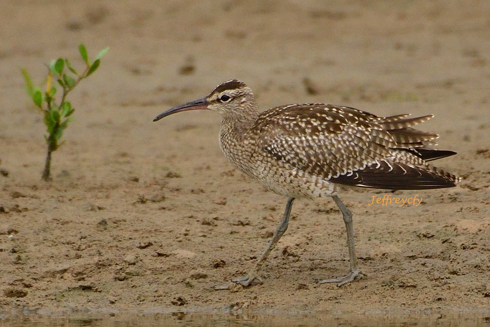 It's a Whimbrel (which is related to sandpipers, so you were close). This is a juvenile and the bill has not yet fully grown but you can see the downturn characteristic of whimbrel and curlews.