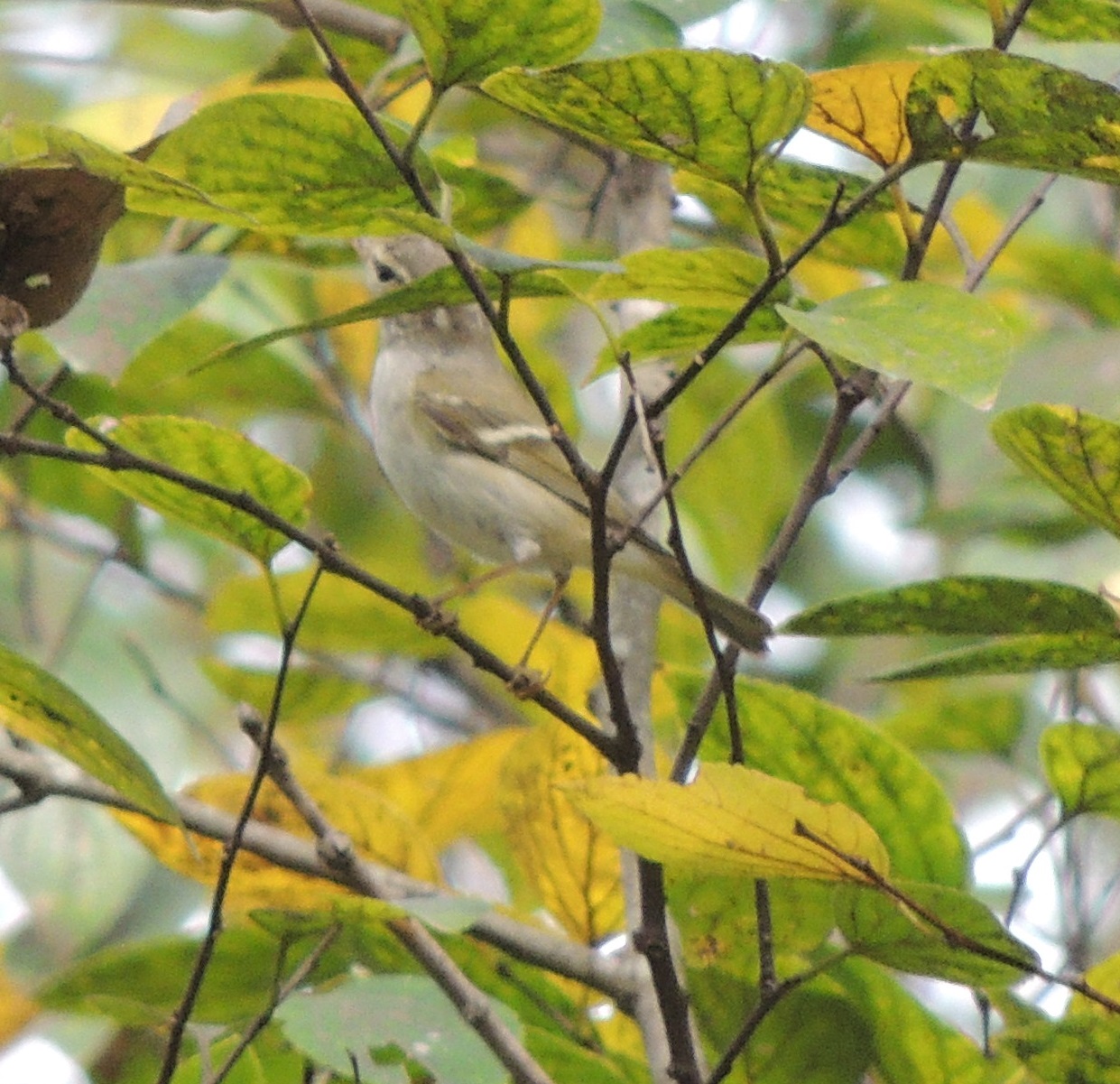 I cannot decide between Yellow-browed and Arctic: I find it hard to judge whether the bird has a second white bar on its wing, which the shadows or the grainy pixels may have obscured, or whether that bar is faint enough to classify this as an Arctic.