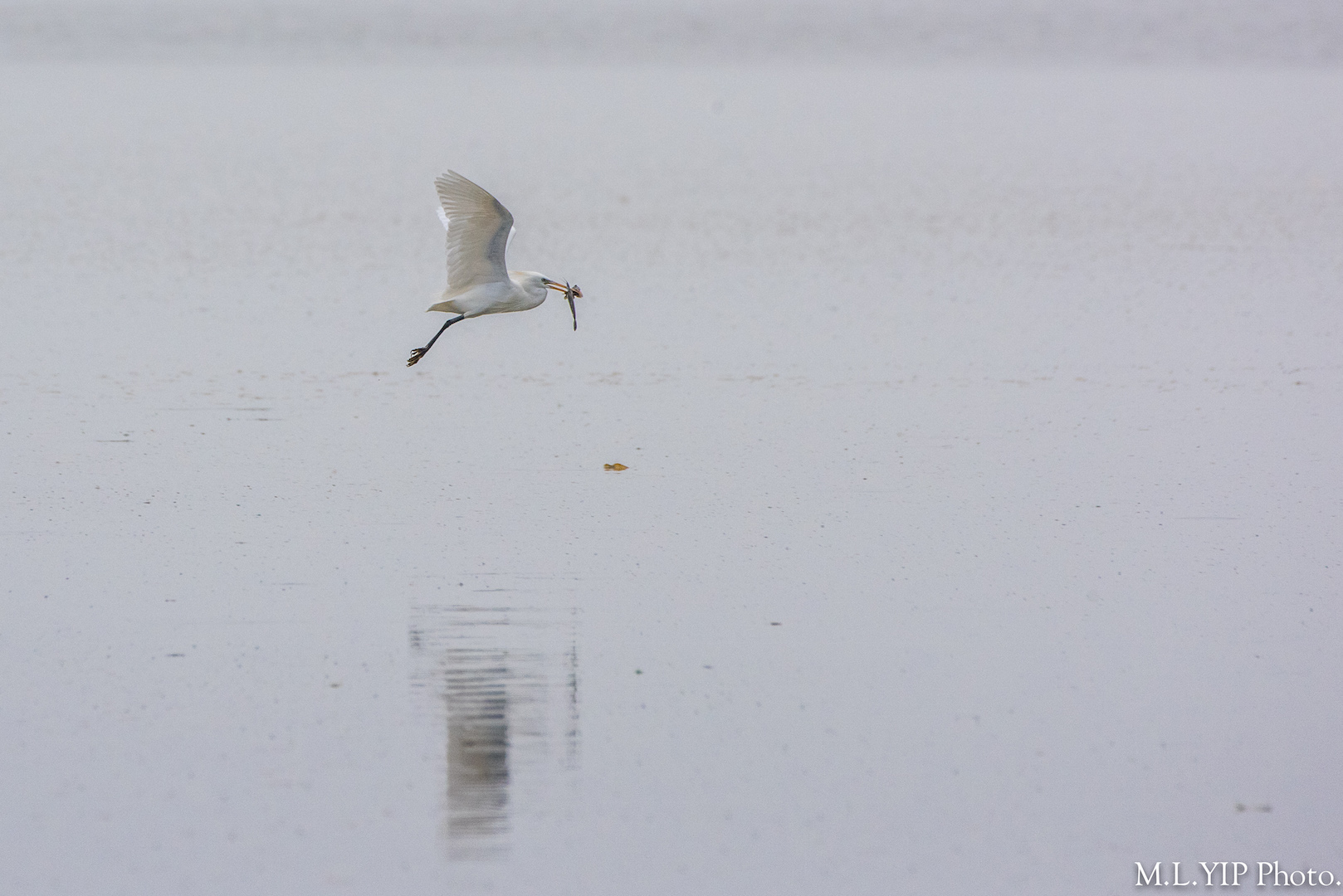 四月二十七日上午,在米埔泥灘老遠外,看到這相信是黃嘴白鷺的鳥兒,捕得一條彈塗魚, 可是馬上有大白鷺走近. 黃嘴白鷺走避了一會, 最終含著小魚拍翼而起, 然後愈飛愈遠.