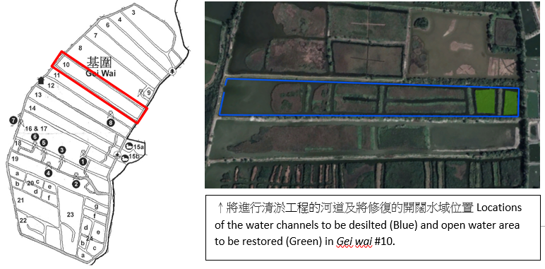 Owing to sedimentation, the channels in Gei wai #10 has been silting up over the years; therefore the channels have gradually become shallow and invaded by terrestrial vegetation and reed which result in a loss of water channels for aquatic fauna and open water area for waterbirds.