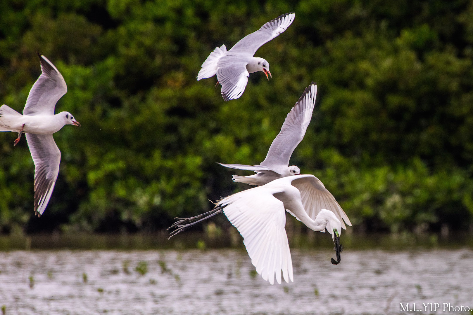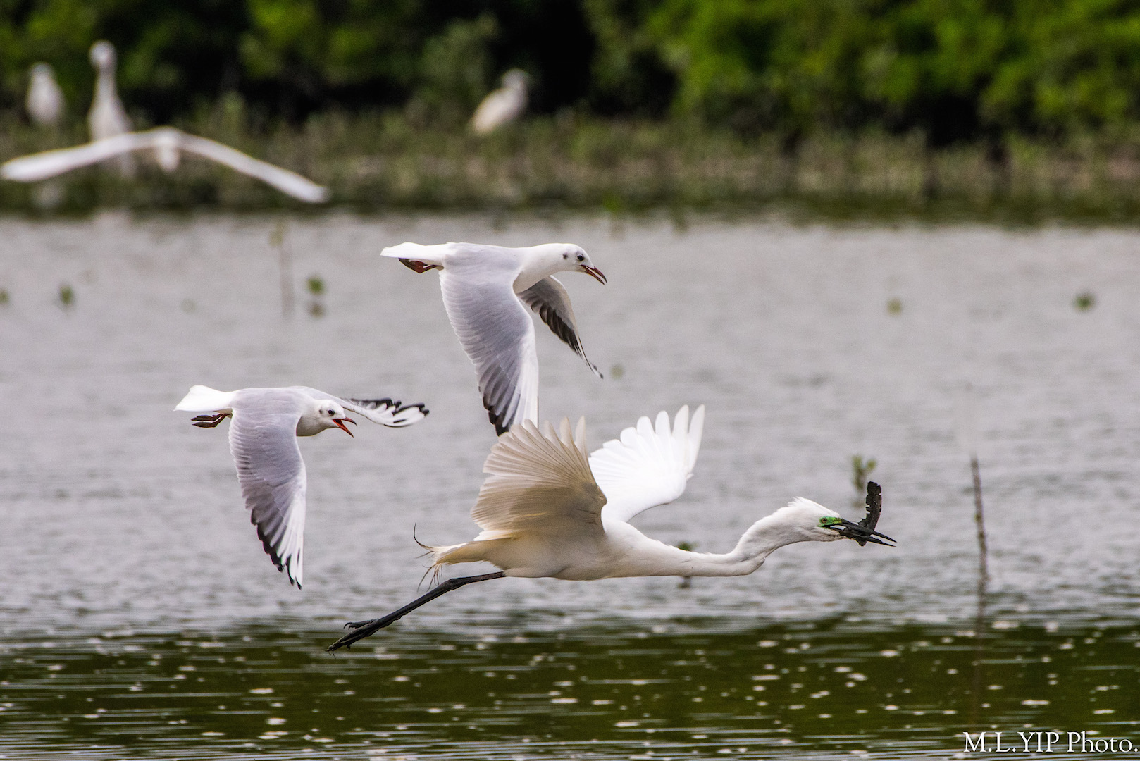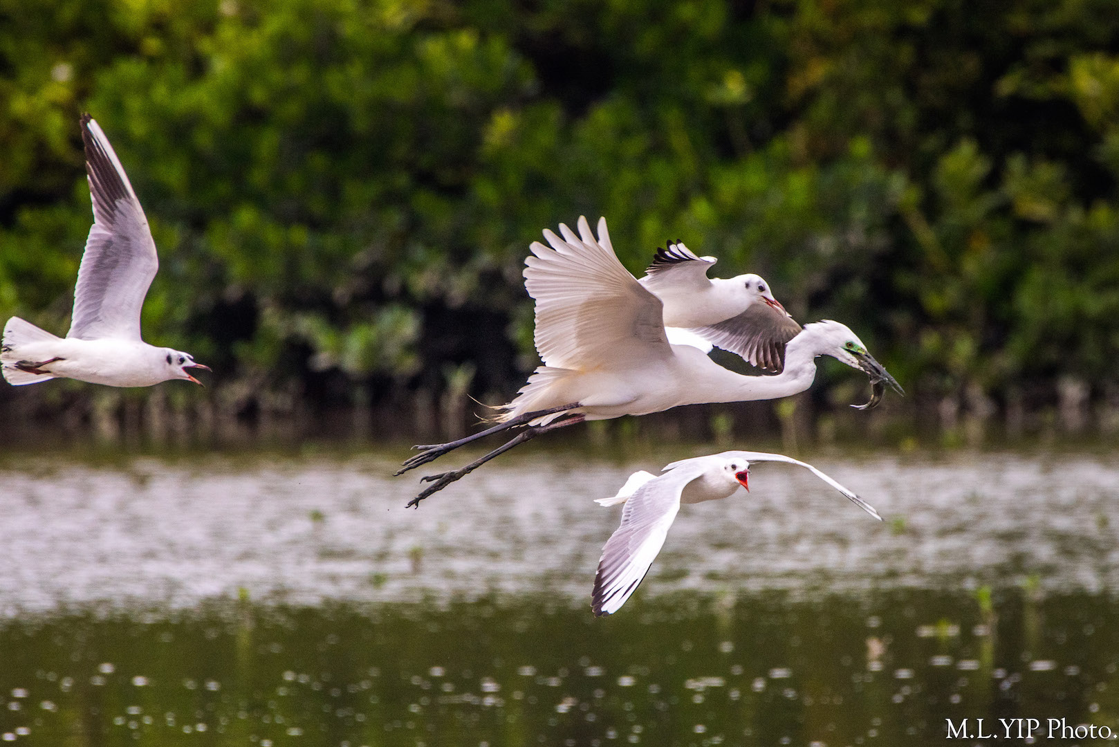 想不體形細小的紅咀鷗,竟然會群起搶奪體形較大的大白鷺的漁穫.