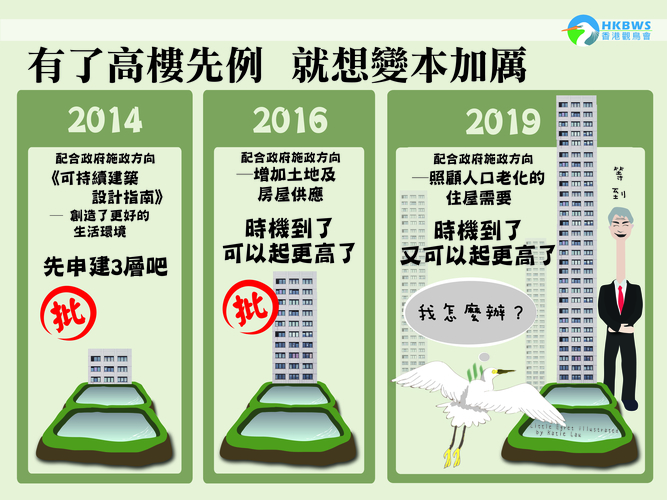 十年過去,政府的施政方向已淪為發展商的賺錢工具。以這塊位於南生圍以南近蠔洲路的土地為例,它位於「濕地緩衝區」之內,但多年來不斷「配合」政府施政而成功申請增加發展密度和樓宇高度。發展商早在2013年已就此地皮向城規會提交建65幢樓高3層的住屋發展申請(A/YL-NSW/224),並在2014年得到批准。同年,發展商再提交規劃申請(A/YL-NSW/233),聲稱為配合政府政策,申請建樓高達12層的住屋,以增加土地及房屋供應。最終城規會於2016有條件批出其住宅項目,住宅樓宇達10層高。最近,發展商新鴻基就再向城規會提交規劃申請(A/YL-NSW/274),聲稱為配合政府「居家安老」政策而申建「跨代共居房屋」,提議興建8幢6至29層高的住宅大樓。政府的施政似乎在放寬在生態敏感地帶上的發展。