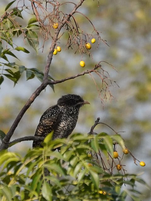 Thank you for the reply. We also thought it to be a common Koel, may be juvenile male. However, the iris was not red in the photo taken. (Sorry, for poor photo taken far away.) Its beak was not big and thick.