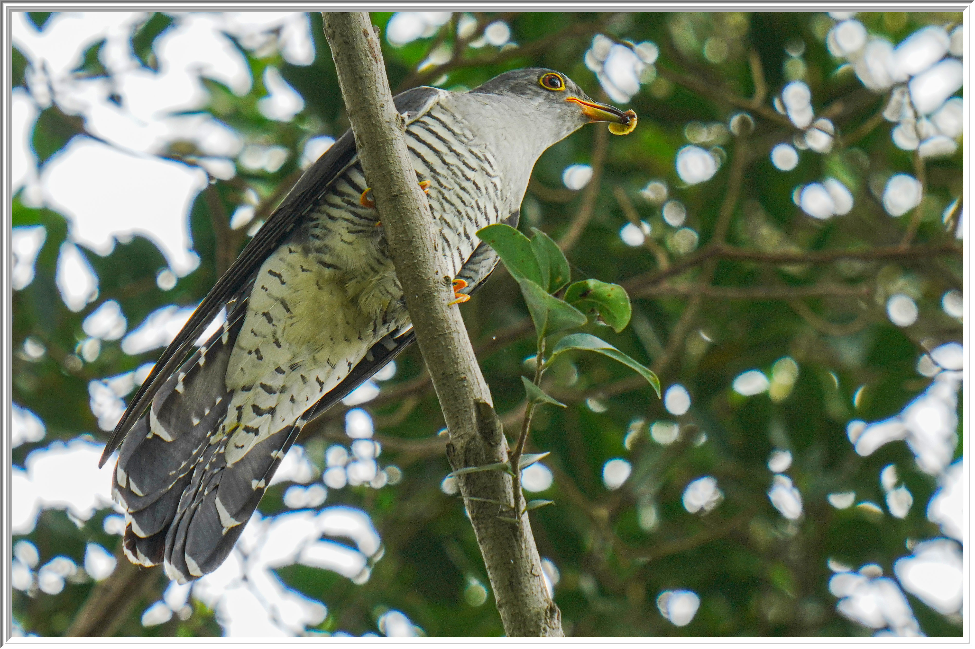Is it possible that this is Oriental Cuckoo? The orange iris is typical of Oriental Cuckoo, whereas Common Cuckoo typically has pale yellow iris. Any view of the upperparts?