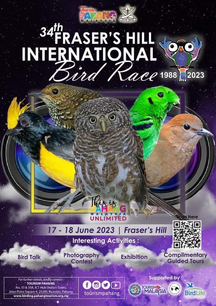 The 34th Fraser's Hill International Bird Race will be scheduled on 17-18 June 2023. You could see more information from scanning the QR code in the picture.