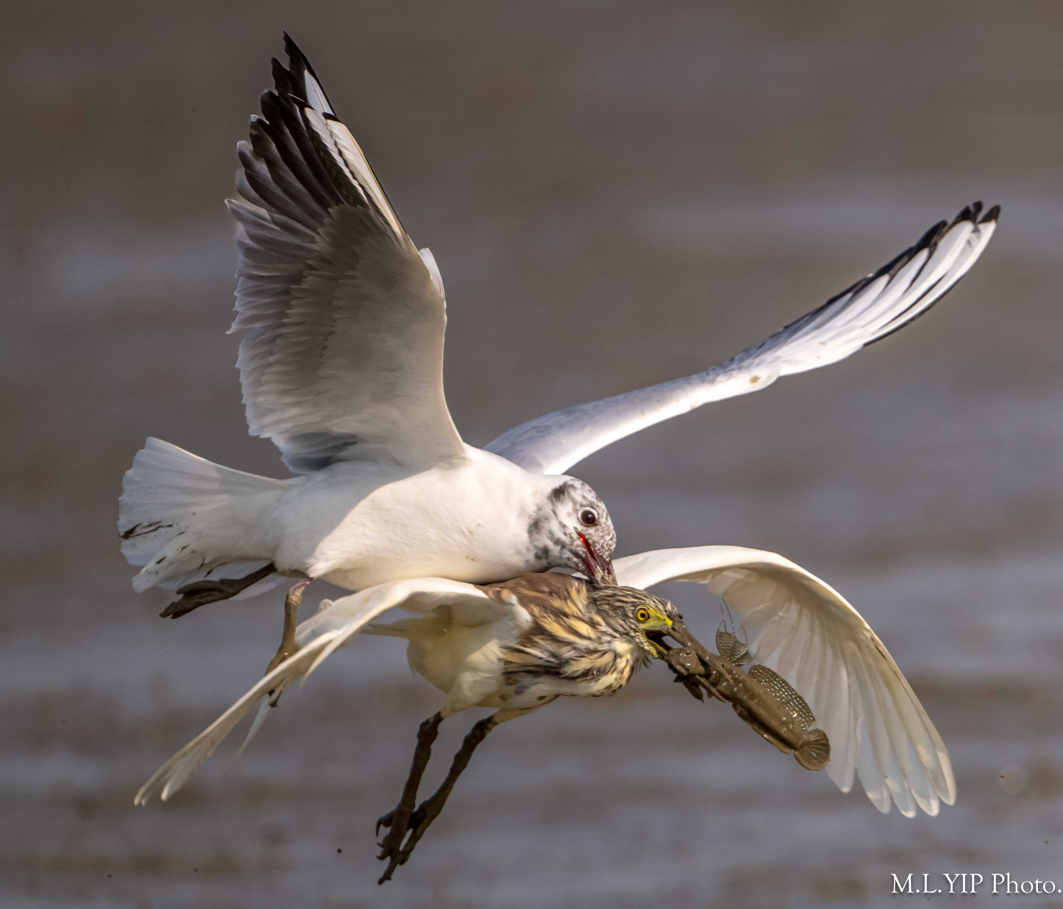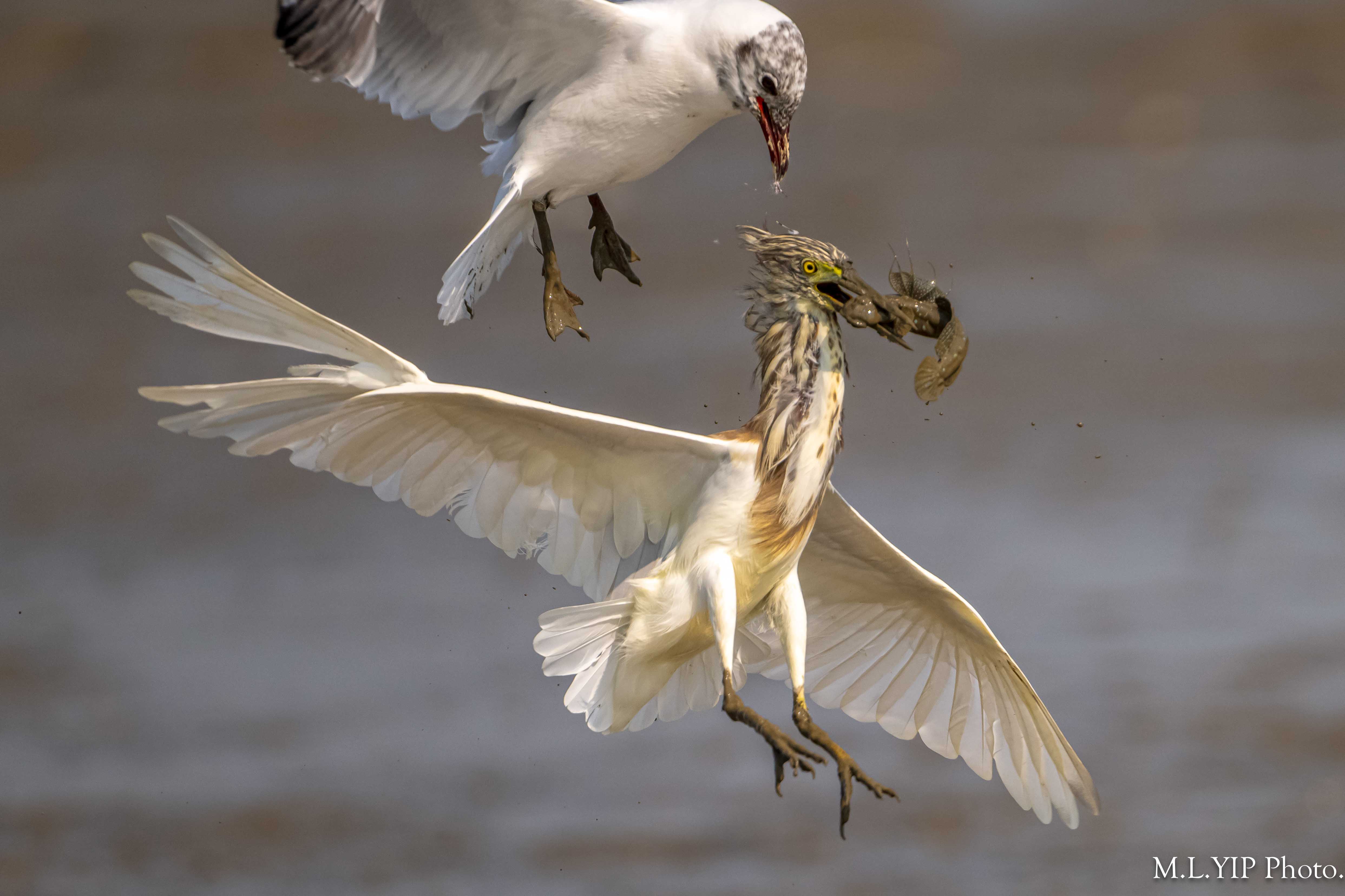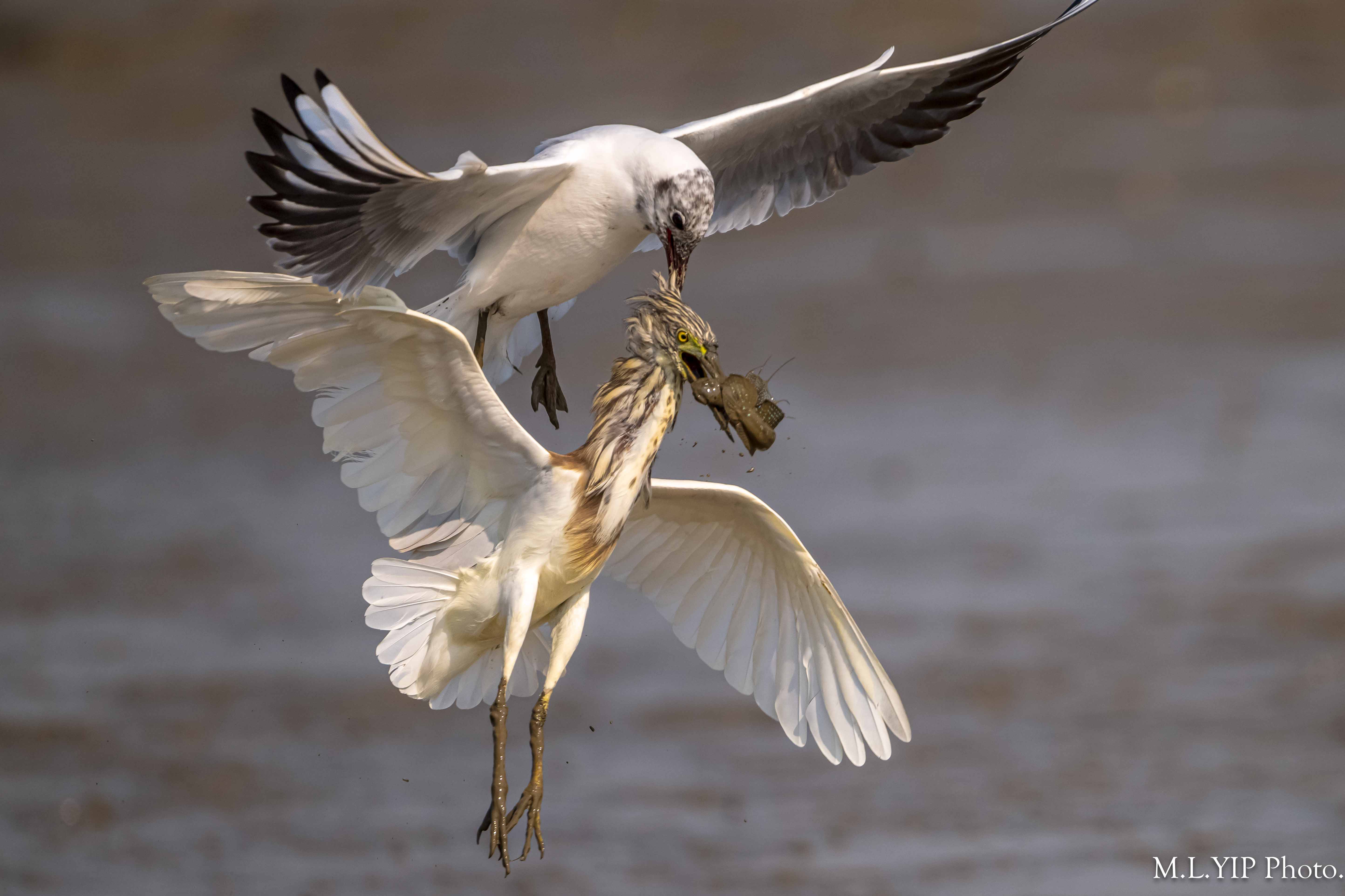 紅嘴鷗搶魚,不過今次卻噬著池鷺頭頂的羽毛,結果池鷺頭頂的羽毛也被扯甩.
