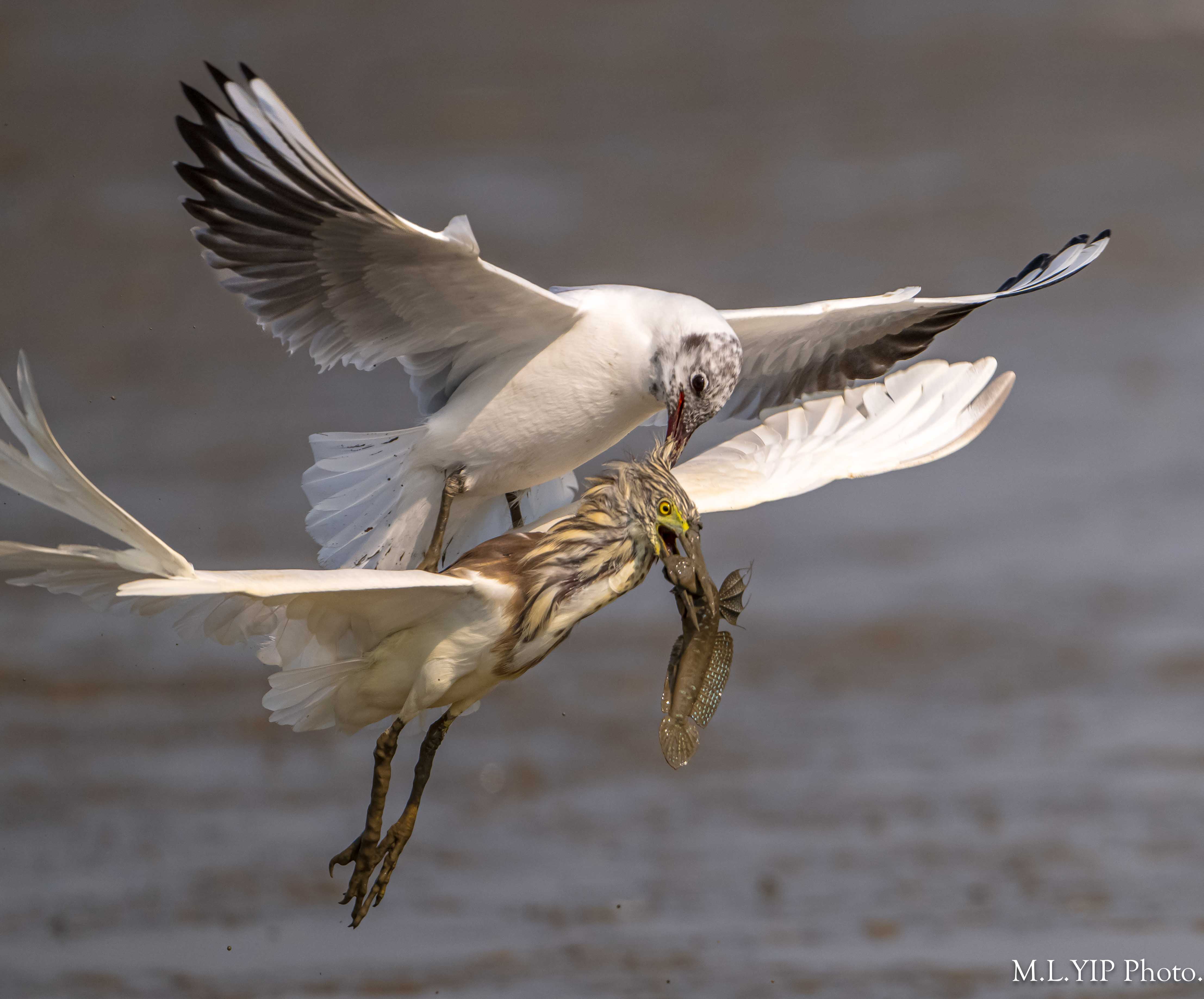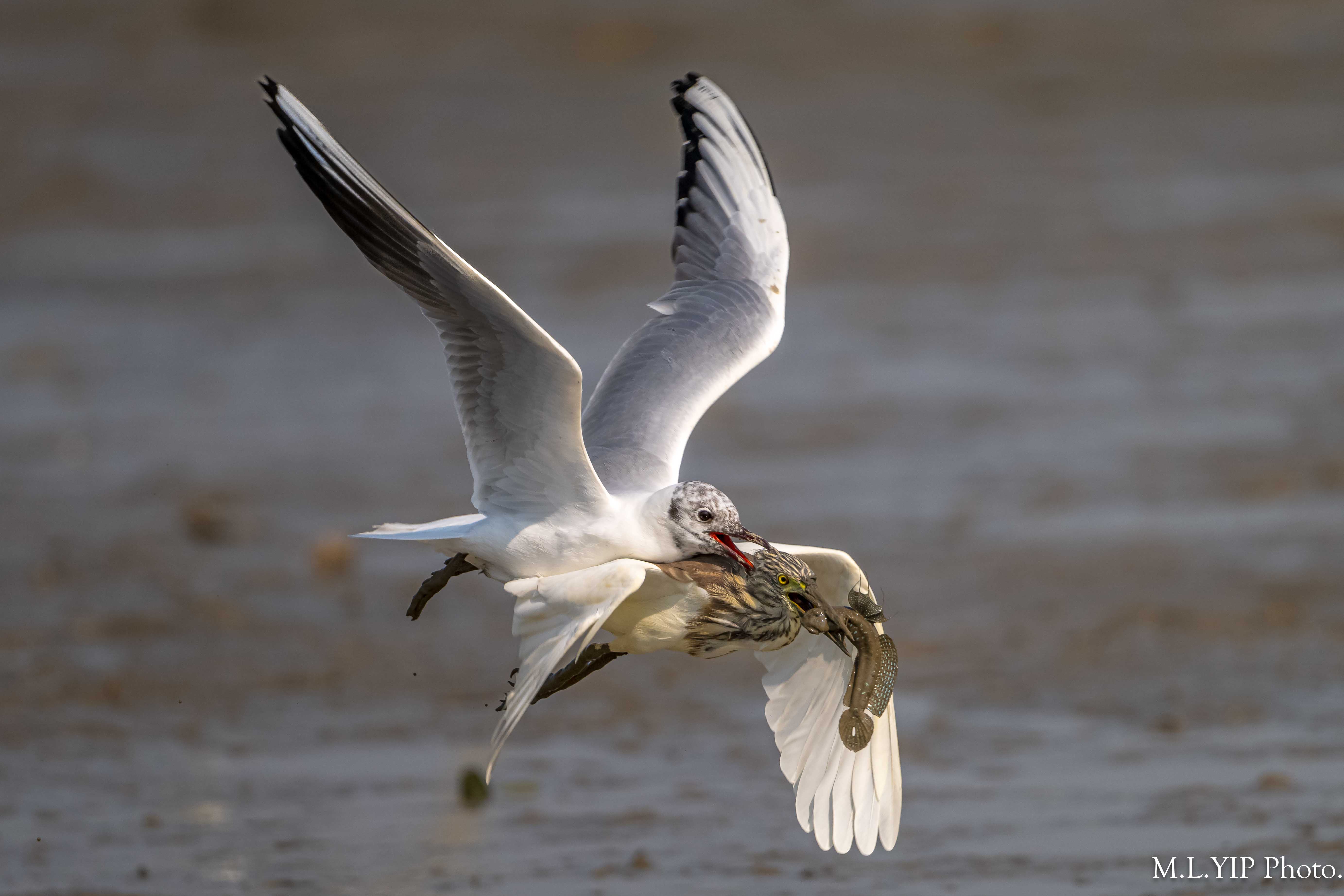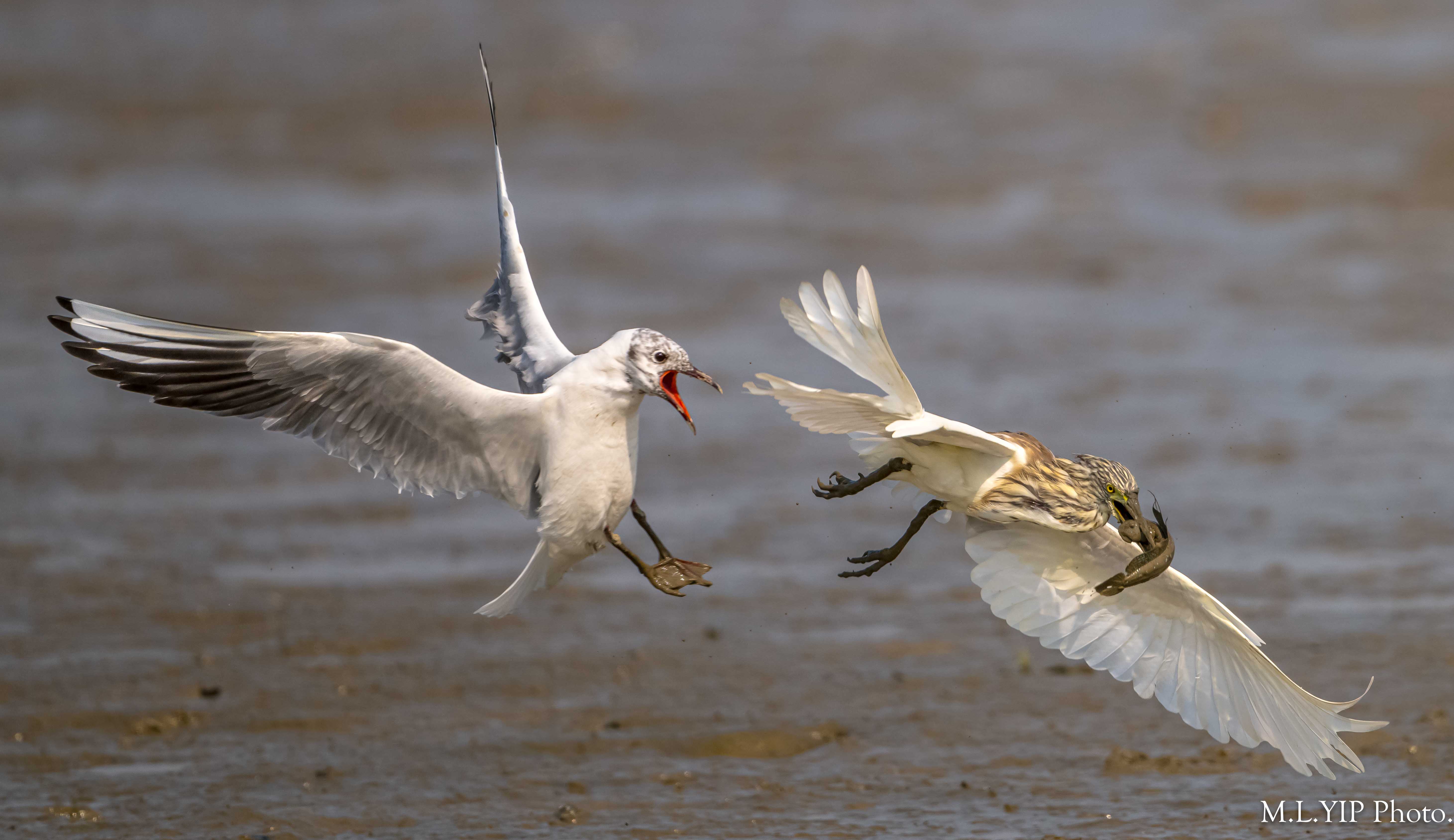 紅嘴鷗搶魚,不過今次卻噬著池鷺頭頂的羽毛,結果池鷺頭頂的羽毛也被扯甩.