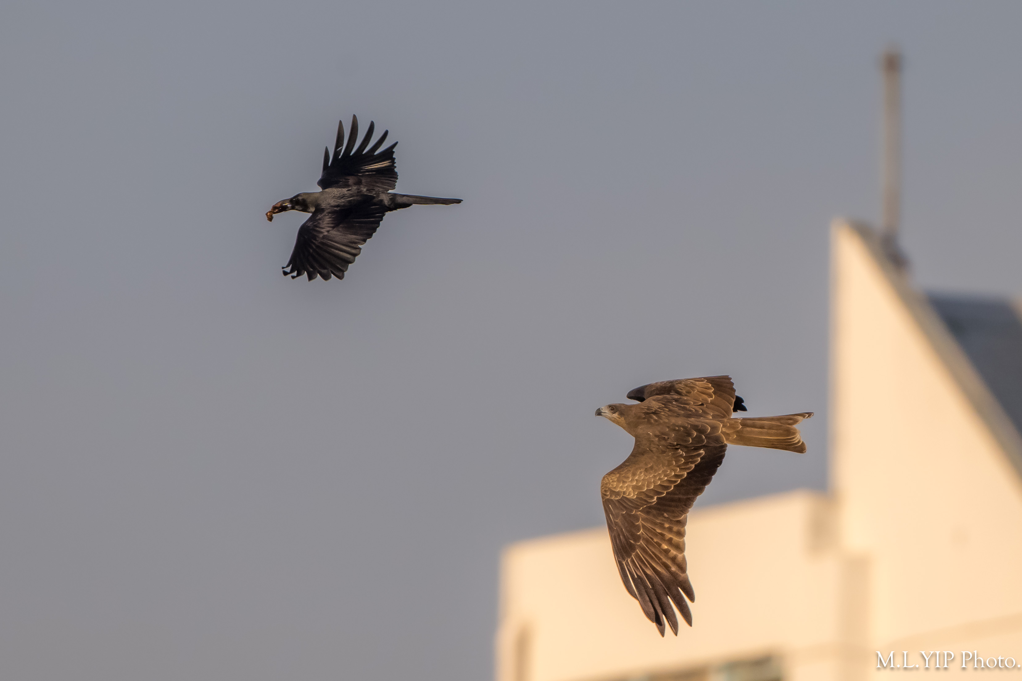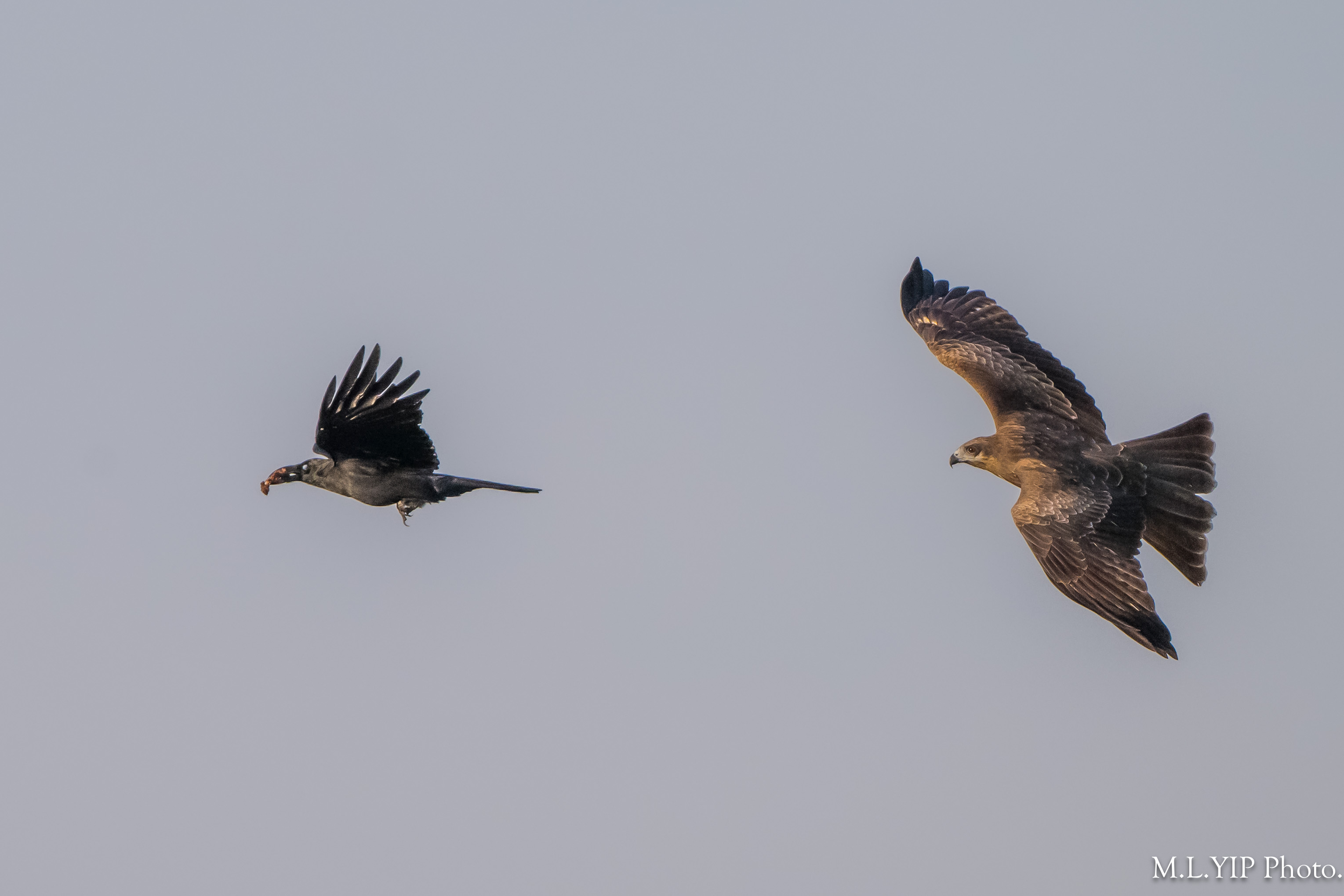 麻鷹想打大嘴鴉的主意,可惜目視所見,麻鷹追了又追一大段距離,都似乎追唔到喎.
