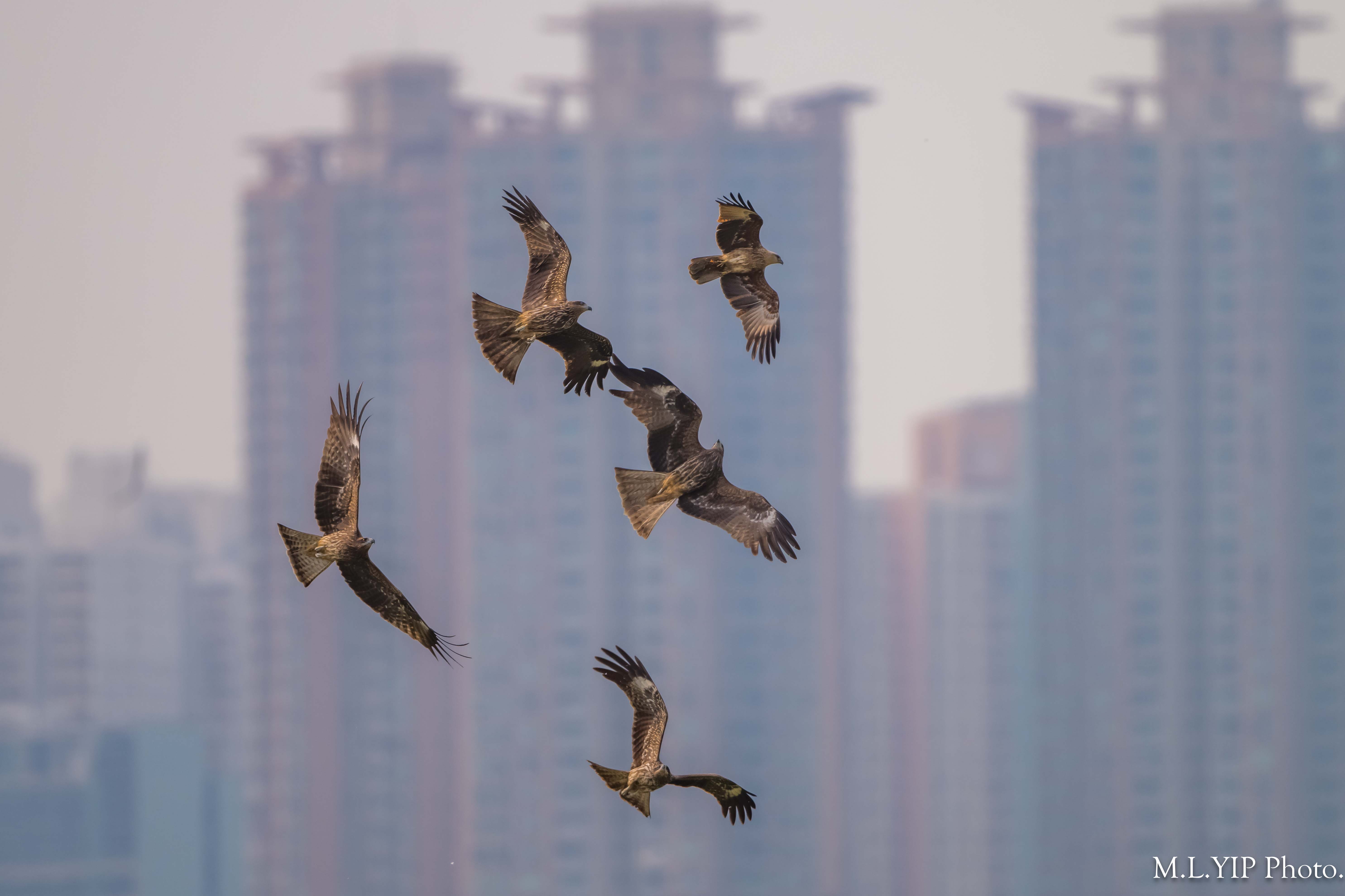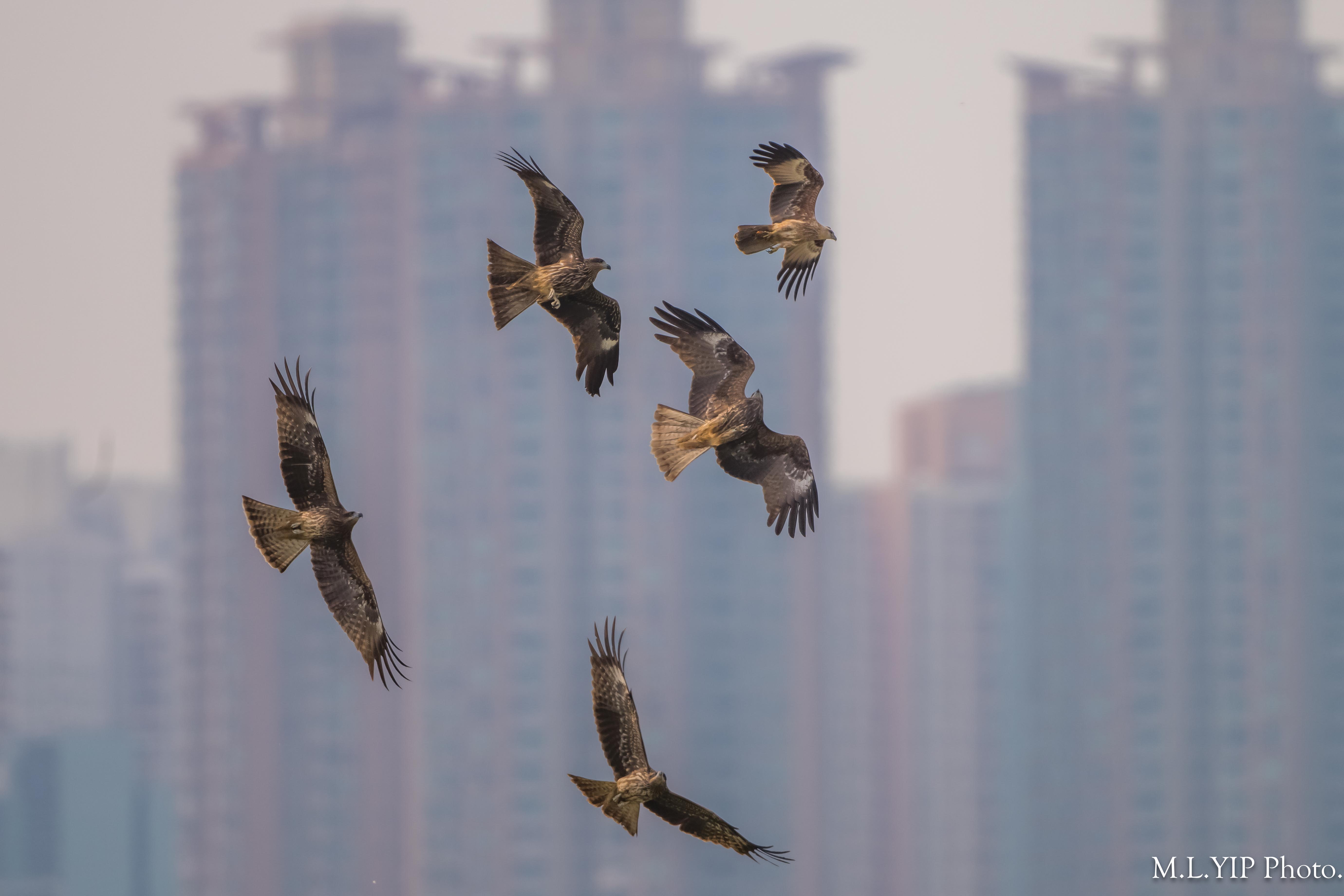 最初祇見一兩隻麻鷹,然後栗鳶似乎在地上執咗啲食物,就四鷹齊撲.