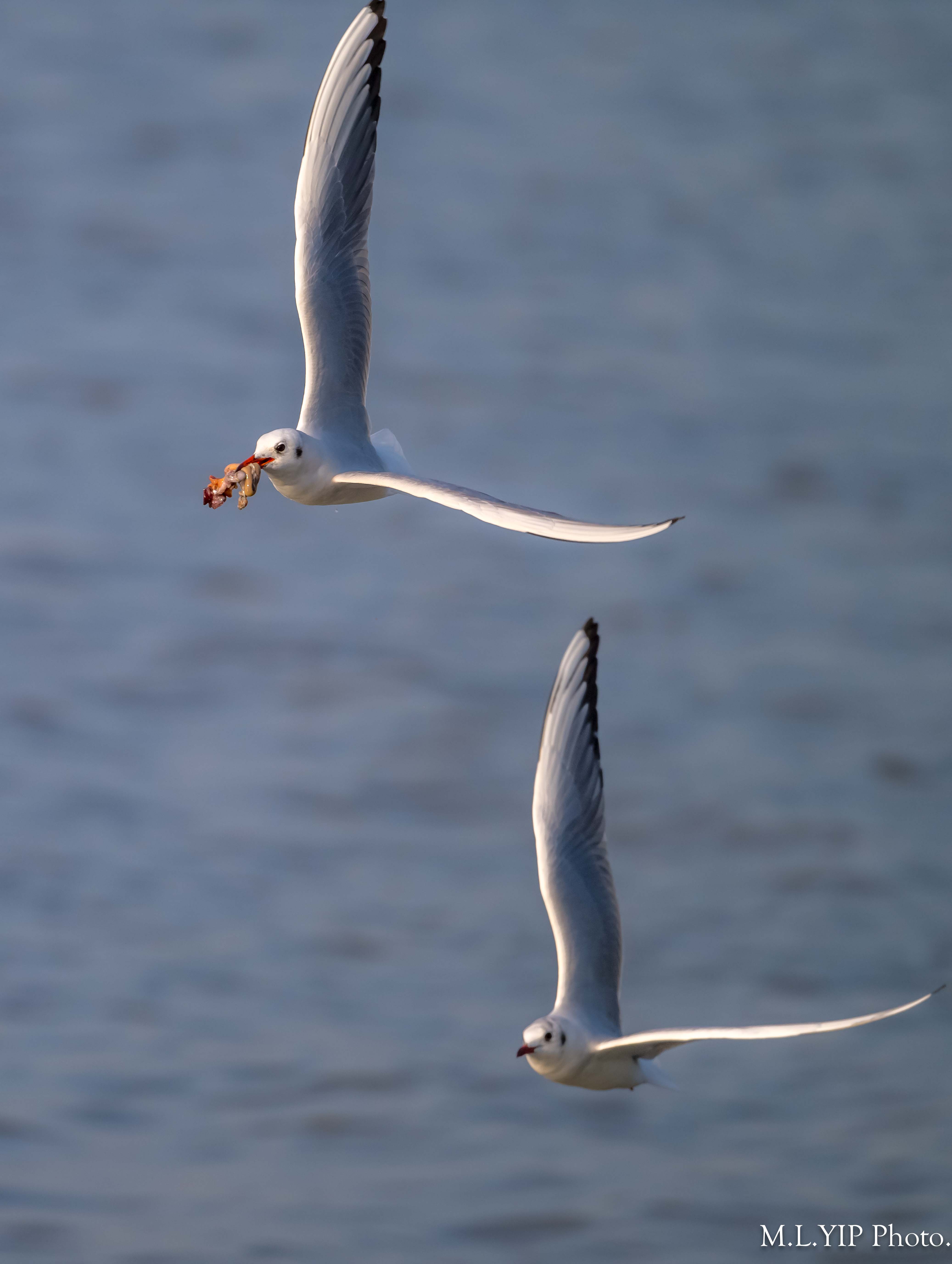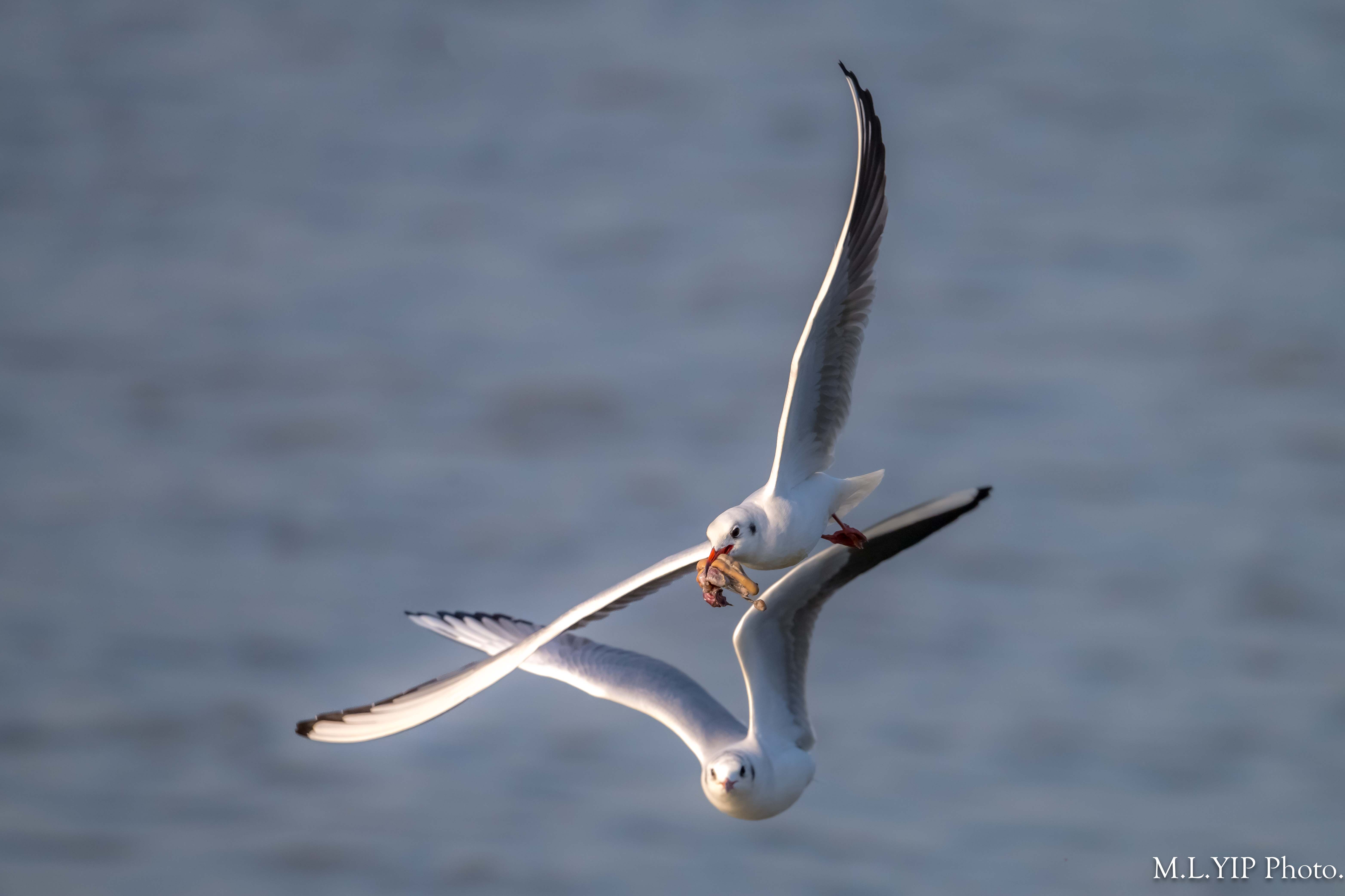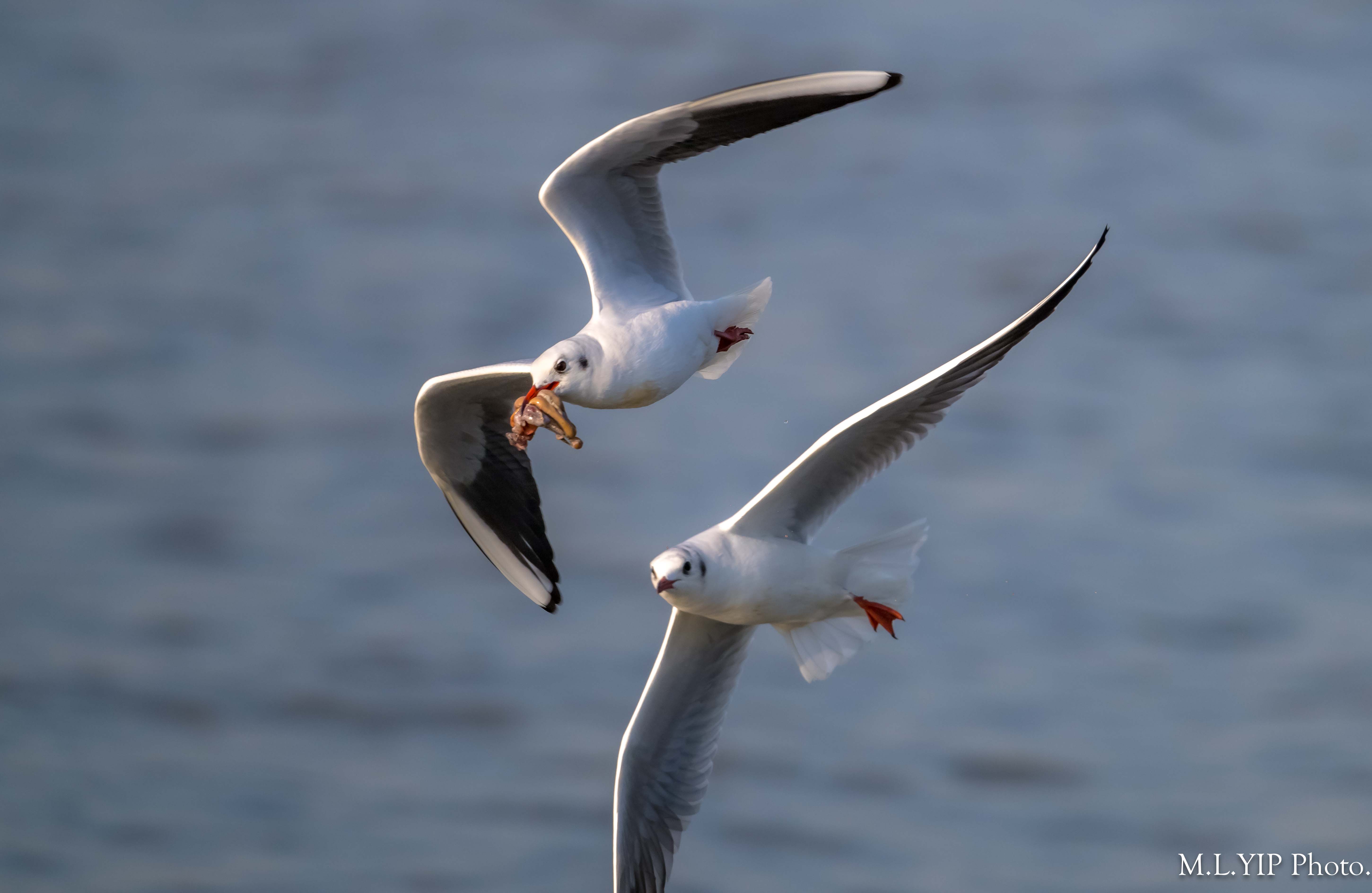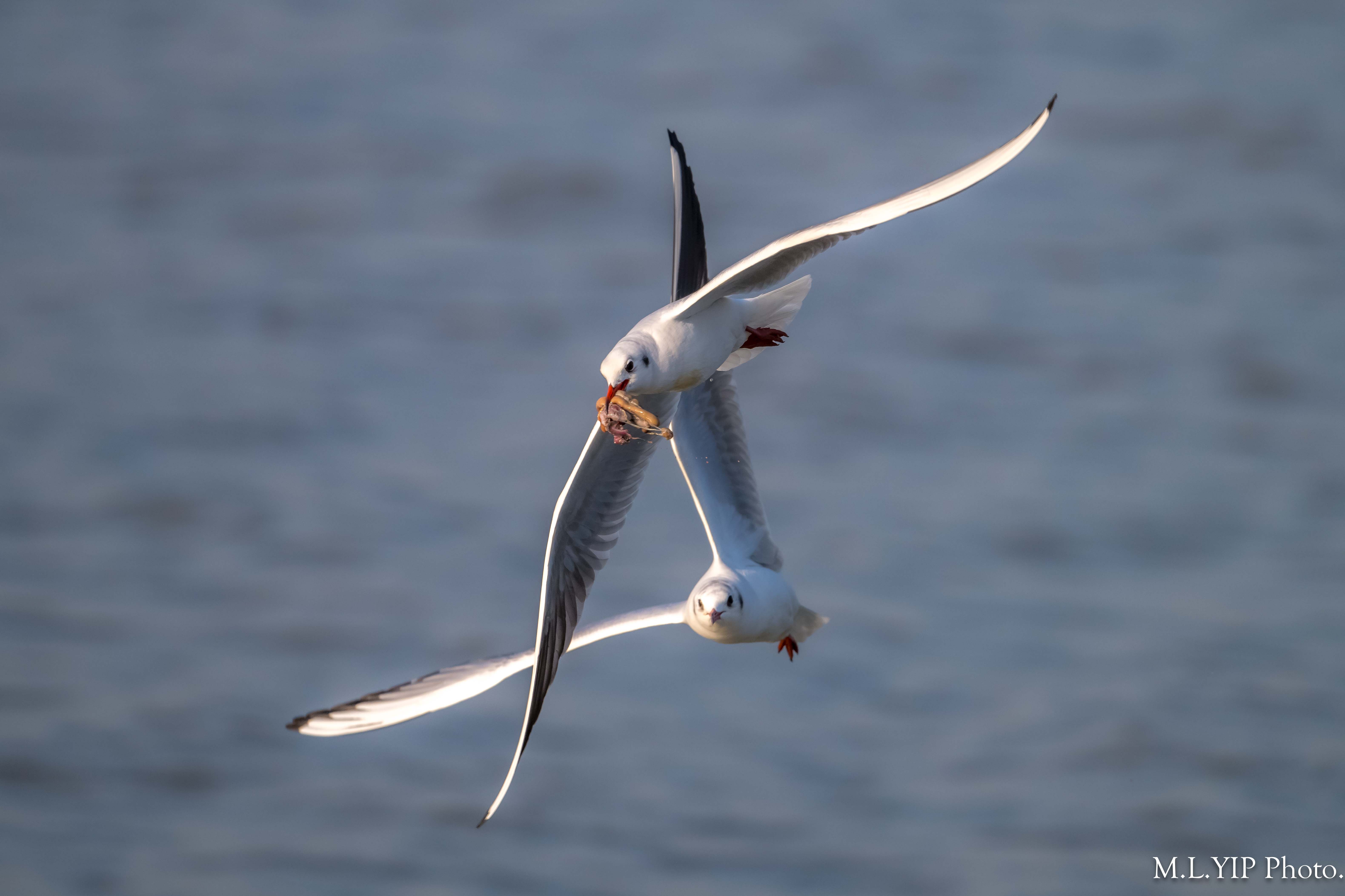 一隻紅嘴鷗撿到食物,另外一隻馬上飛近想搶奪.