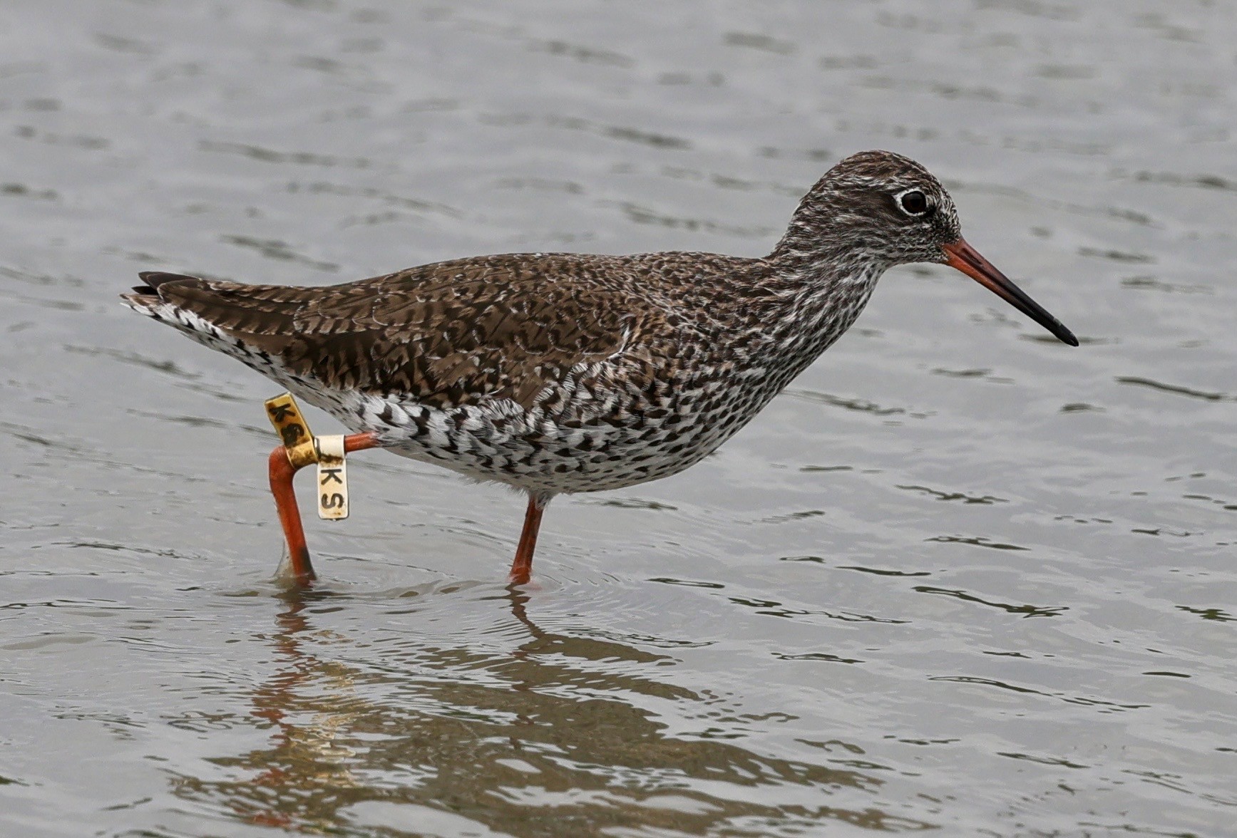 Common Redshank KS was ringed on 8-Nov-2021 as a 1st winter bird. It was resighted 17 times in MP, Shenzhen Futian and Tsim Bei Tsui. Last record on 9-Mar-26.