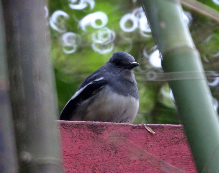 It is an Oriental Magpie Robin, but it is an adult female not a juvenile (which is brown and spotty)
